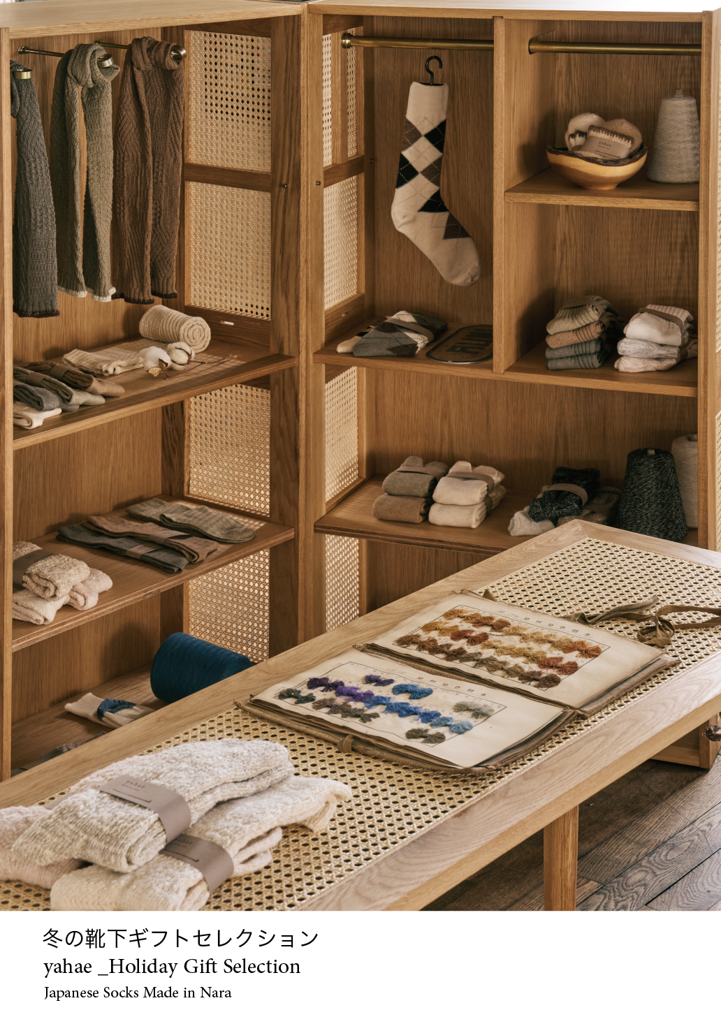 yahaeから、この冬に開催するPop Up Storeのお知らせです。普段常設している清澄店舗以外にも、銀座、奈良でお買い求めいただけます。一部のPop Upでは、私たちも奈良から参加するので、在廊日に是非皆様とお会いできることを楽しみにしています。靴下の話、靴下の町・広陵町の話、工場の話、ざっくばらんにお話しできると嬉しいです。皆様のお越しをお待ちしております。