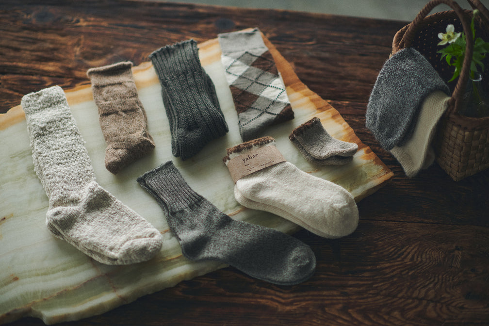 “yahae” is our brand born in 2020, named after our founder “Yahei”, who originally started the company as a cotton business. While learning from the history we’ve built, we also value looking toward the future to sustainably keep creating. The socks we discussed and designed turned out to be ones that cherish the present time and make us want to wear them for as long as we can.