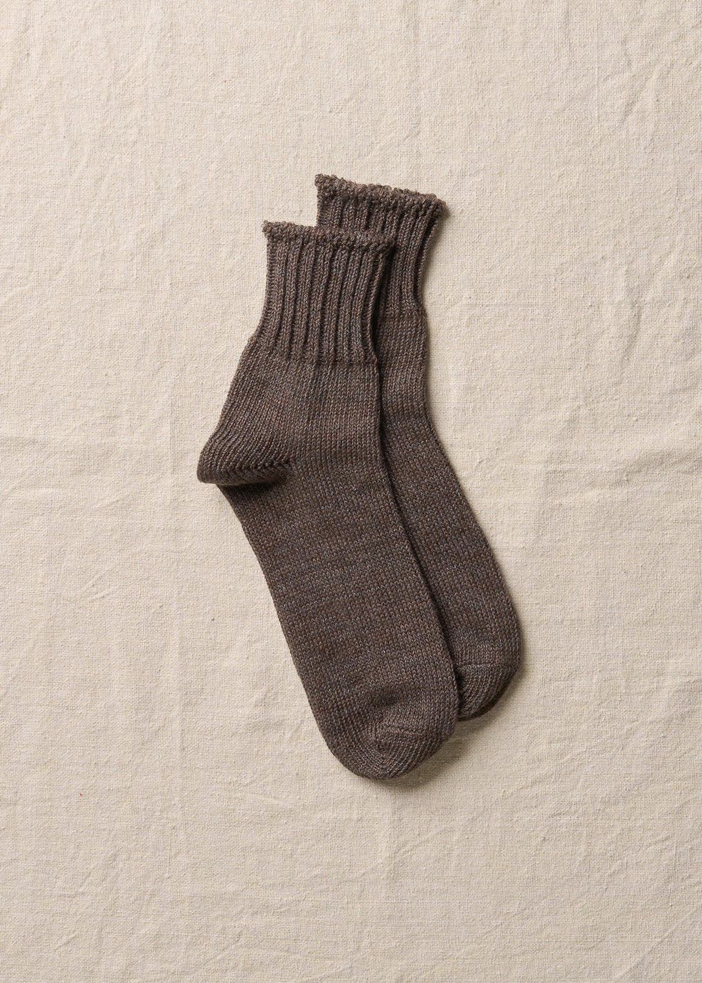 リネンとオーガニックコットンを引き揃えて編み立てたリブソックス。柔らかなコットンと清涼感のあるリネンの風合いどちらも感じられます。ローゲージの編み機でざっくりと編み立てており、快適で通気性の良い履き心地です。