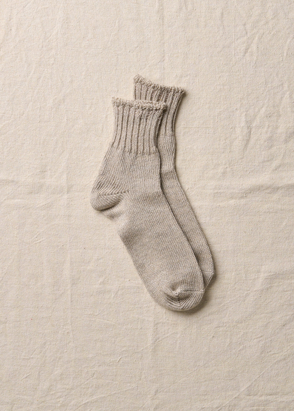 リネンとオーガニックコットンを引き揃えて編み立てたリブソックス。柔らかなコットンと清涼感のあるリネンの風合いどちらも感じられます。ローゲージの編み機でざっくりと編み立てており、快適で通気性の良い履き心地です。