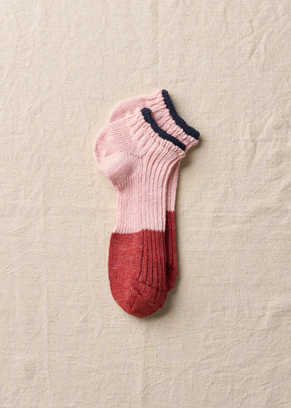 吸水性・速乾性に優れた清涼感のあるリネンの糸をローゲージの編み機で編み立てたショートソックス。土踏まずにサポートゴム入り。履き口は肌あたりの良いオーガニックコットンを使用しています。