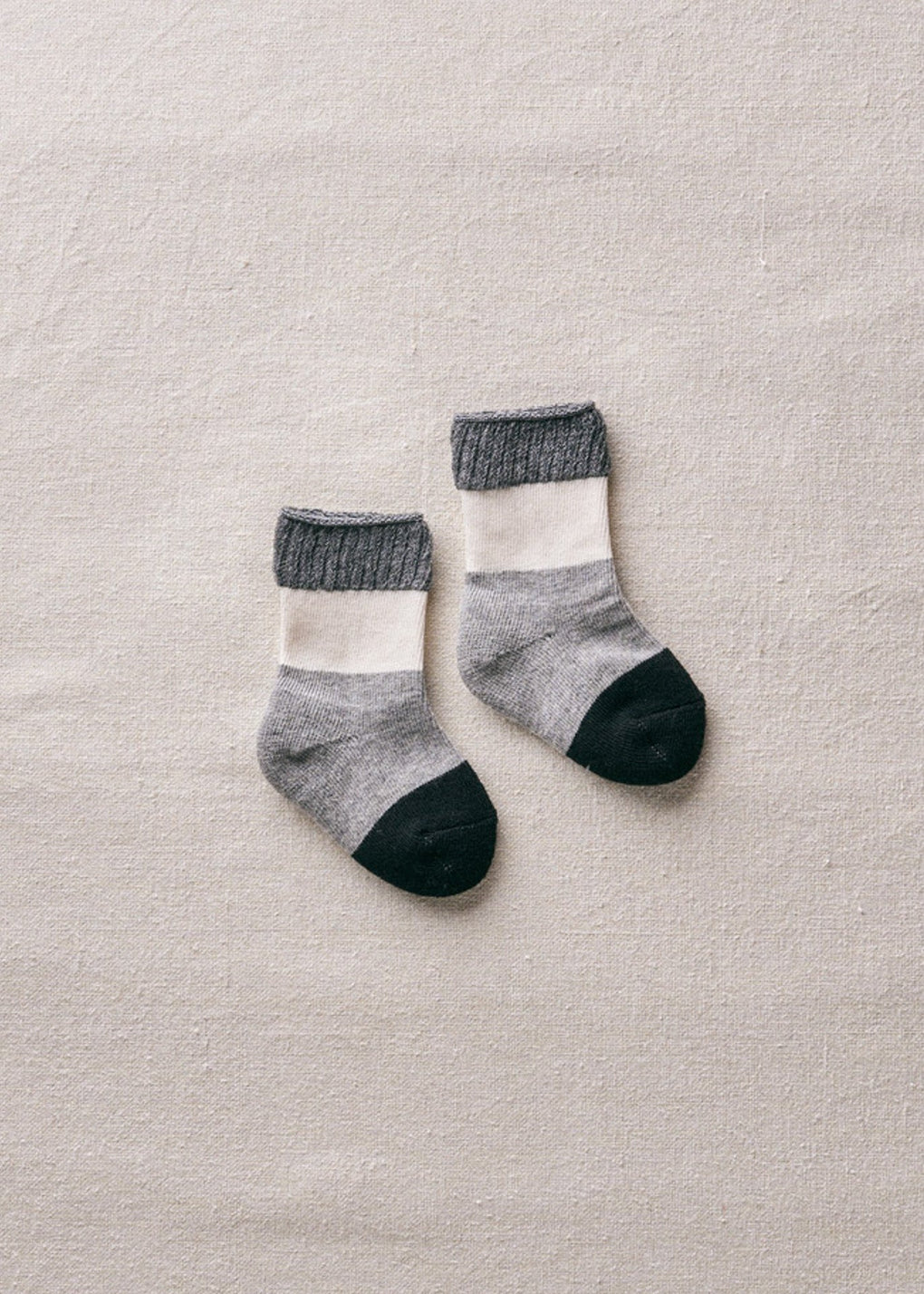 オーガニックコットンで編み立てたベビーパイルソックス。足底はパイル編みでクッション性を持たせ、甲側は靴の中で圧迫感が少ない平編みを用いました。履き口はあたたかみのある編み方で変化を付けています。