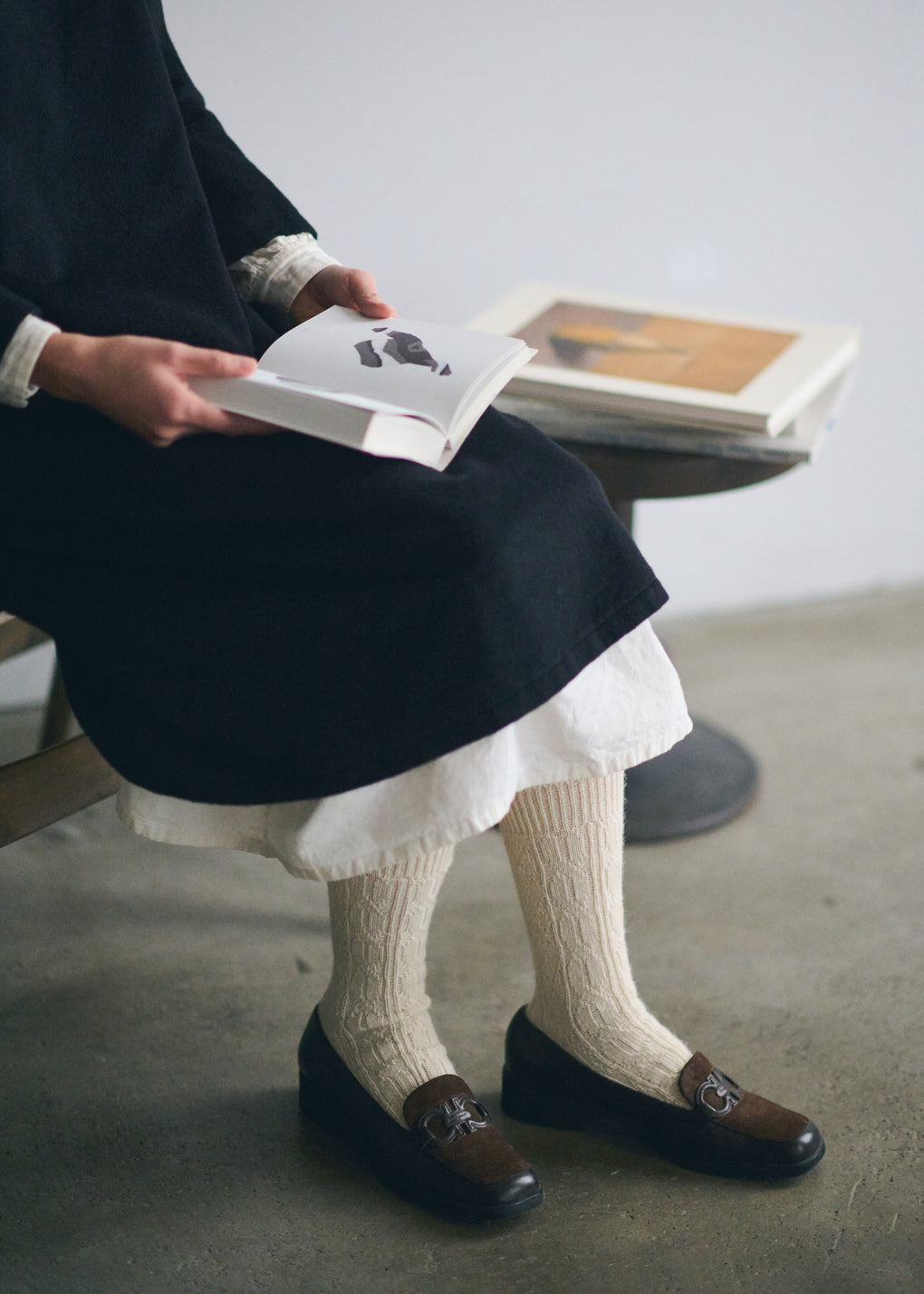 アルパカ100%の糸を使用した、旧式のダブルシリンダーの編み機で編み立てたケーブル柄のローゲージソックスです。懐かしい、レトロなケーブル柄です。