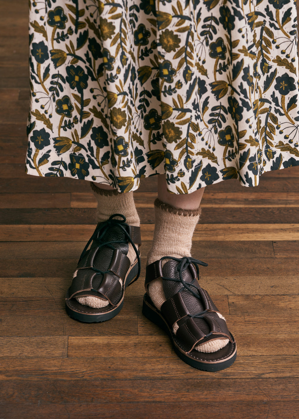 アルパカとオーガニックコットンの糸で編み立てたあたたかなパイル編みソックスは、寒い季節にぴったりです。履き口は、その編み目の形状から"はまぐりミシン"とよばれる古くから日本で使われているミシンで刺繍しています。
