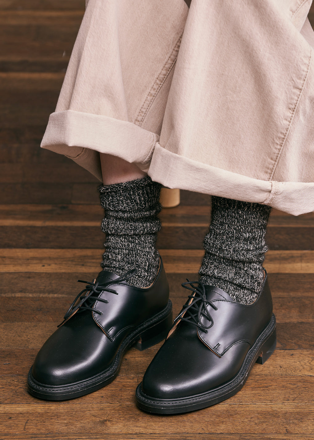 保温性・吸湿性に優れたアルパカと速乾性・耐久性に優れたリネンを撚糸して編み立てました。アルパカ独特のぬめり感とリネンのシャリ感が合わさり、快適な履き心地です。