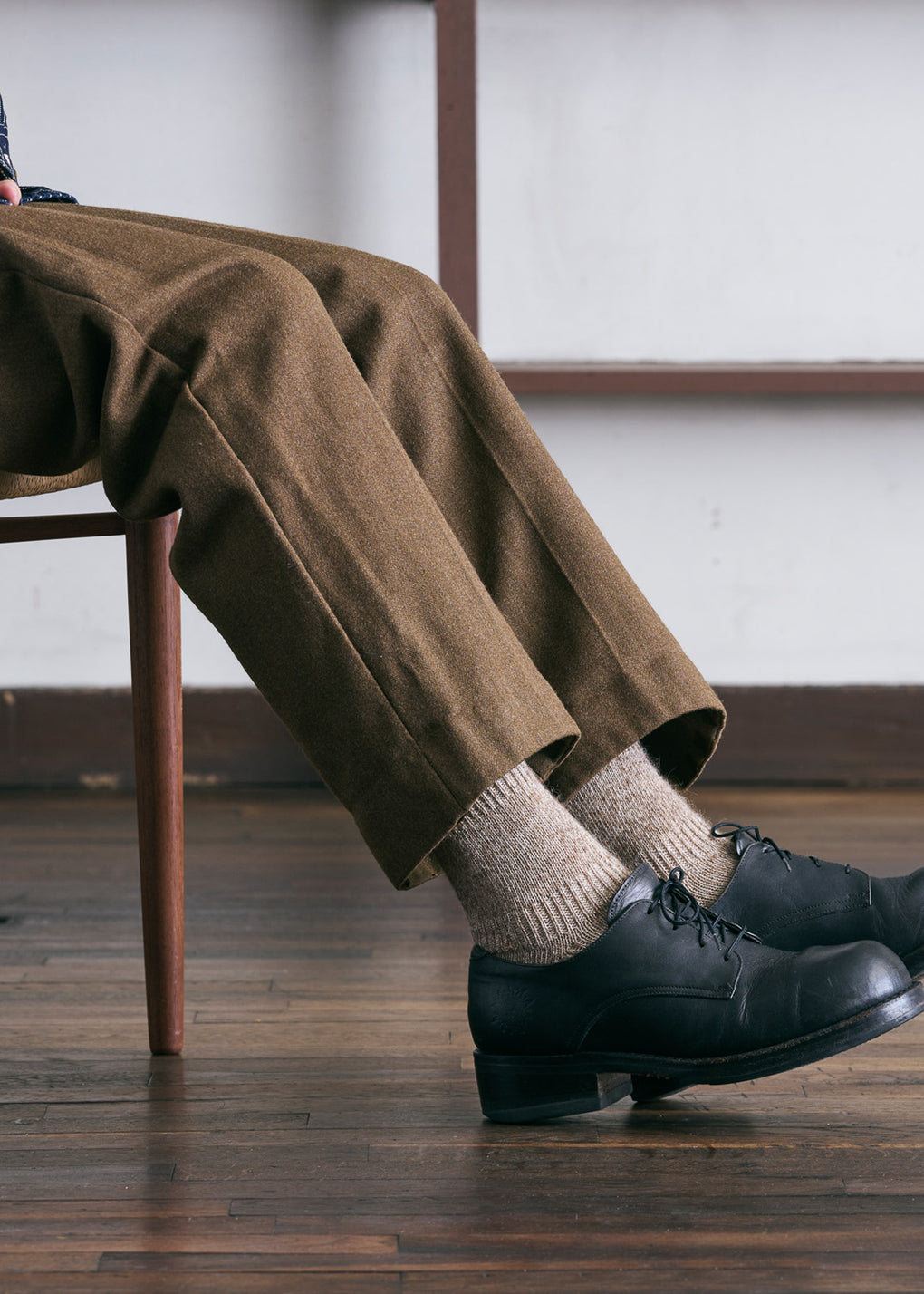 保温性・吸湿性に優れたアルパカと速乾性・耐久性に優れたリネンを撚糸して編み立てました。アルパカ独特のぬめり感とリネンのシャリ感が合わさり、快適な履き心地です。