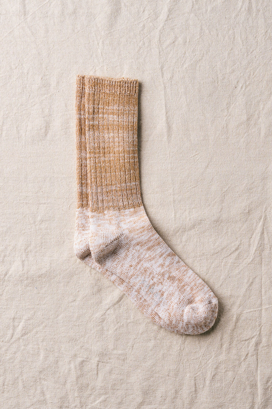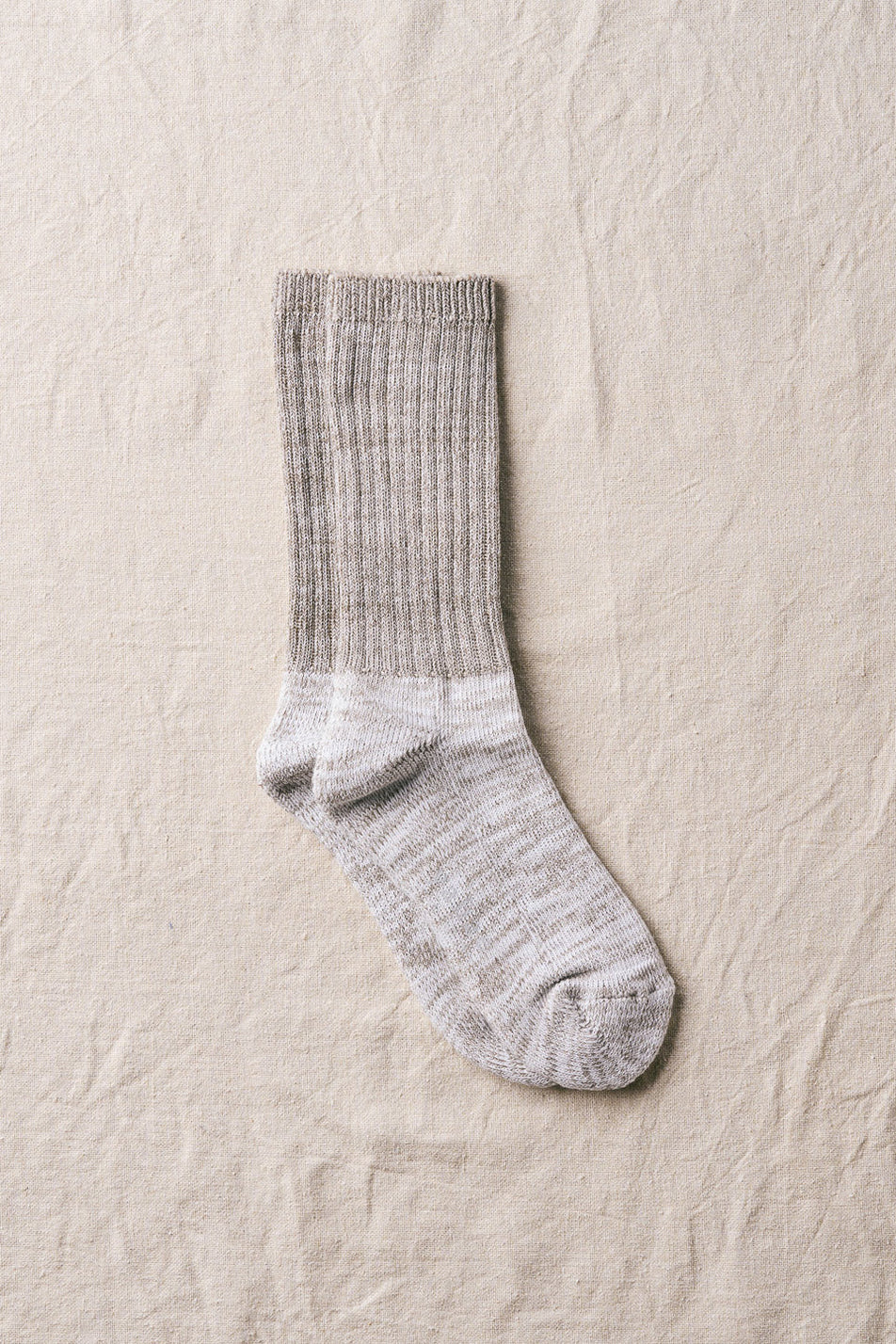 軍の靴下から着想を得た、日常使いの道具として最適な足底パイルのリブ編みソックスです。足底のパイル編みと土踏まずのサポートゴムで快適な履き心地です。丈はふくらはぎを優しく包み込む長めの丈です。毎朝の散歩などワークアウトに最適です。