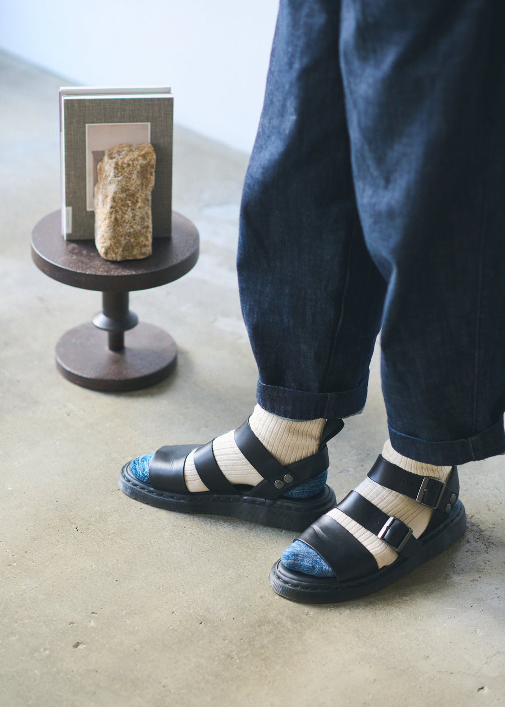 五倍子染めとは、ウルシ科の植物にできる「むしコブ」 を原料とした天然の染めです。多くのタンニンが含まれ、それ真っ黒とは異なる深みのあるグレーの発色です。JIS規格をクリアした抗菌作用を持つので足元を快適に包みます。