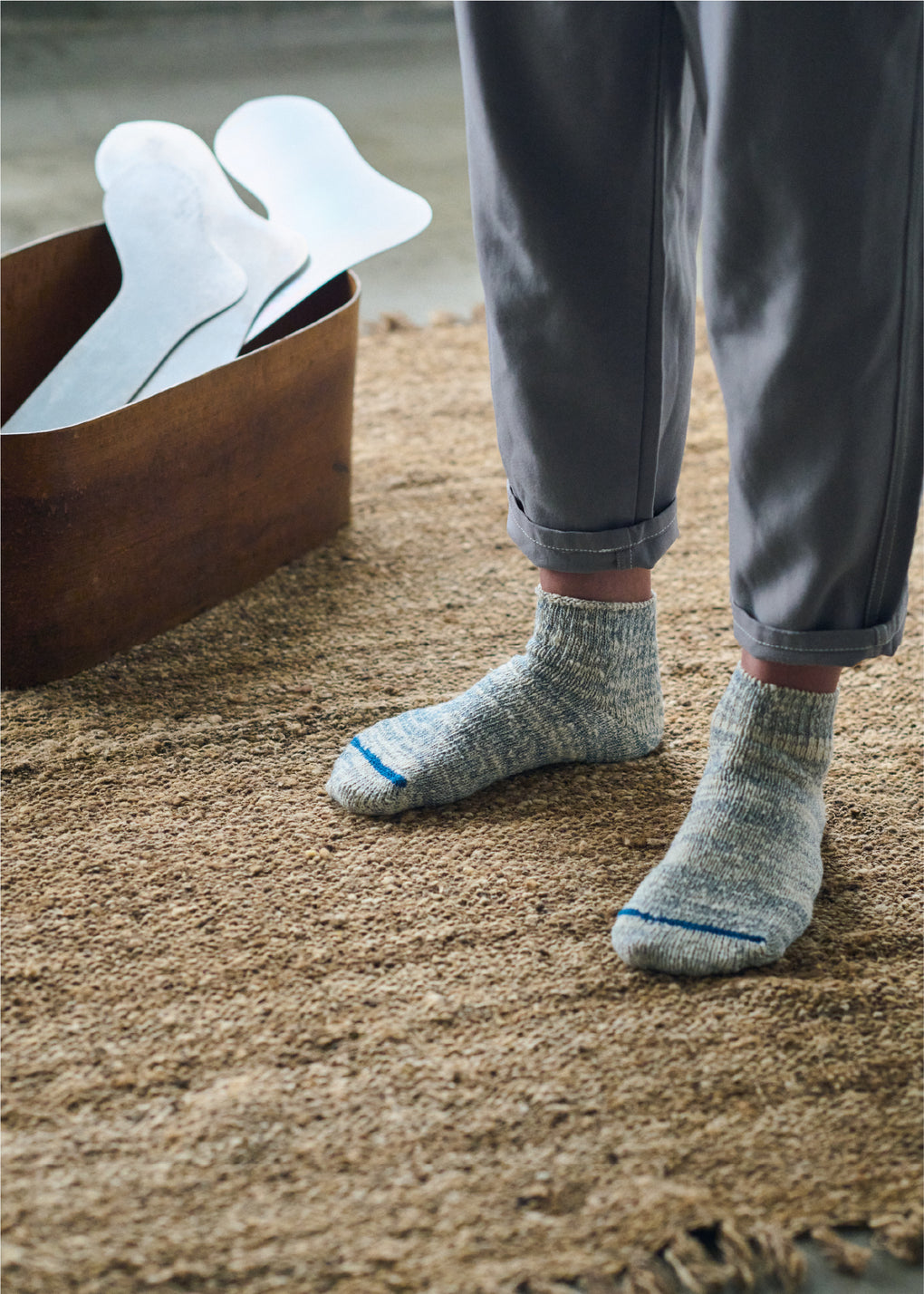 日本独自の紡績方法「ガラ紡」の糸を締め付けの少ない編み地で優しく編み立てた靴下です。ルームソックス としておうち時間に履くと心地よく毎日に寄り添ってくれます。とても豊かな風合いで、タオルのように優しく足を包み込んでくれます。黄色は、沖縄で染められたフクギ染めです。