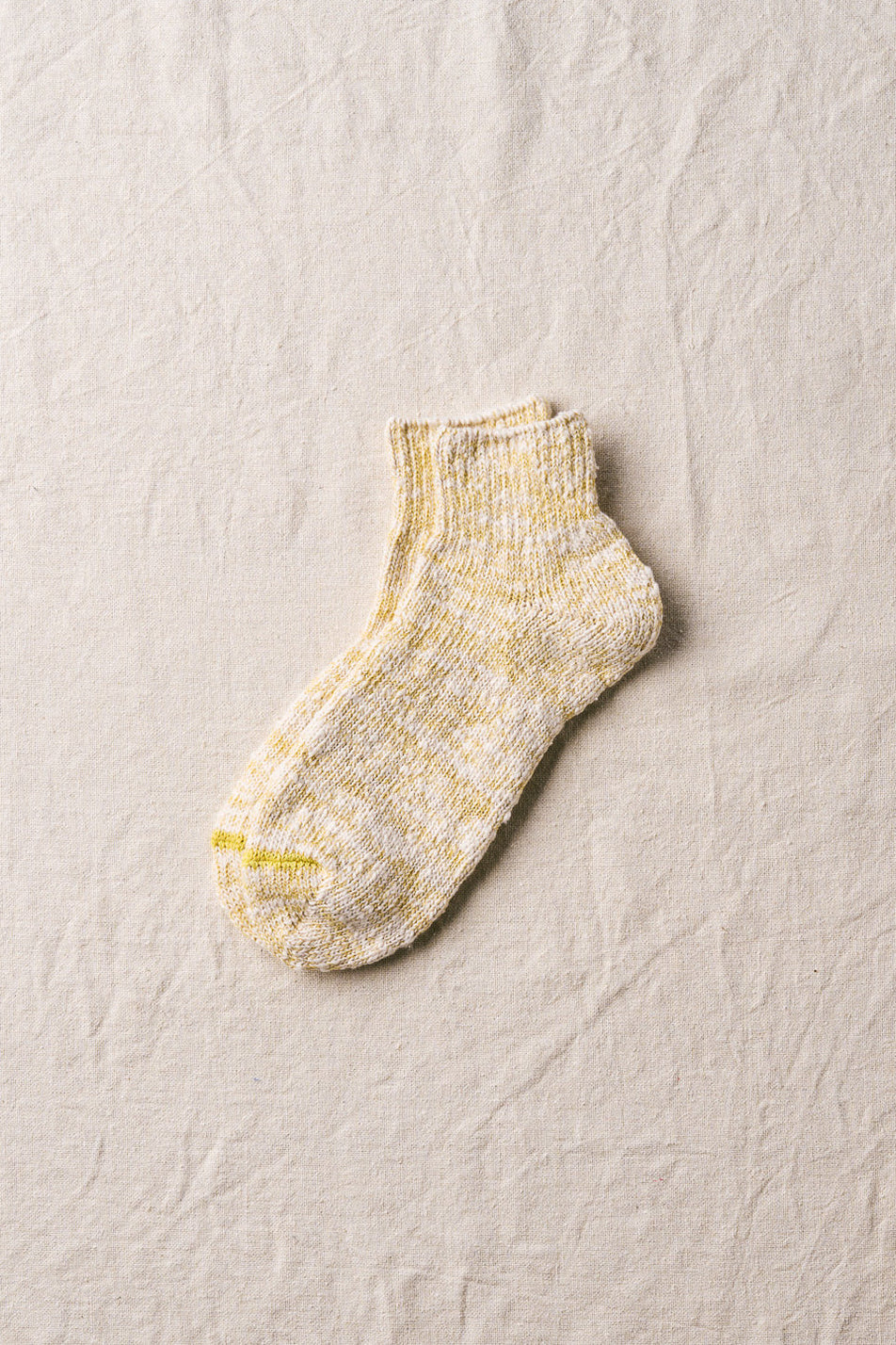 日本独自の紡績方法「ガラ紡」の糸を締め付けの少ない編み地で優しく編み立てた靴下です。ルームソックス としておうち時間に履くと心地よく毎日に寄り添ってくれます。とても豊かな風合いで、タオルのように優しく足を包み込んでくれます。黄色は、沖縄で染められたフクギ染めです。