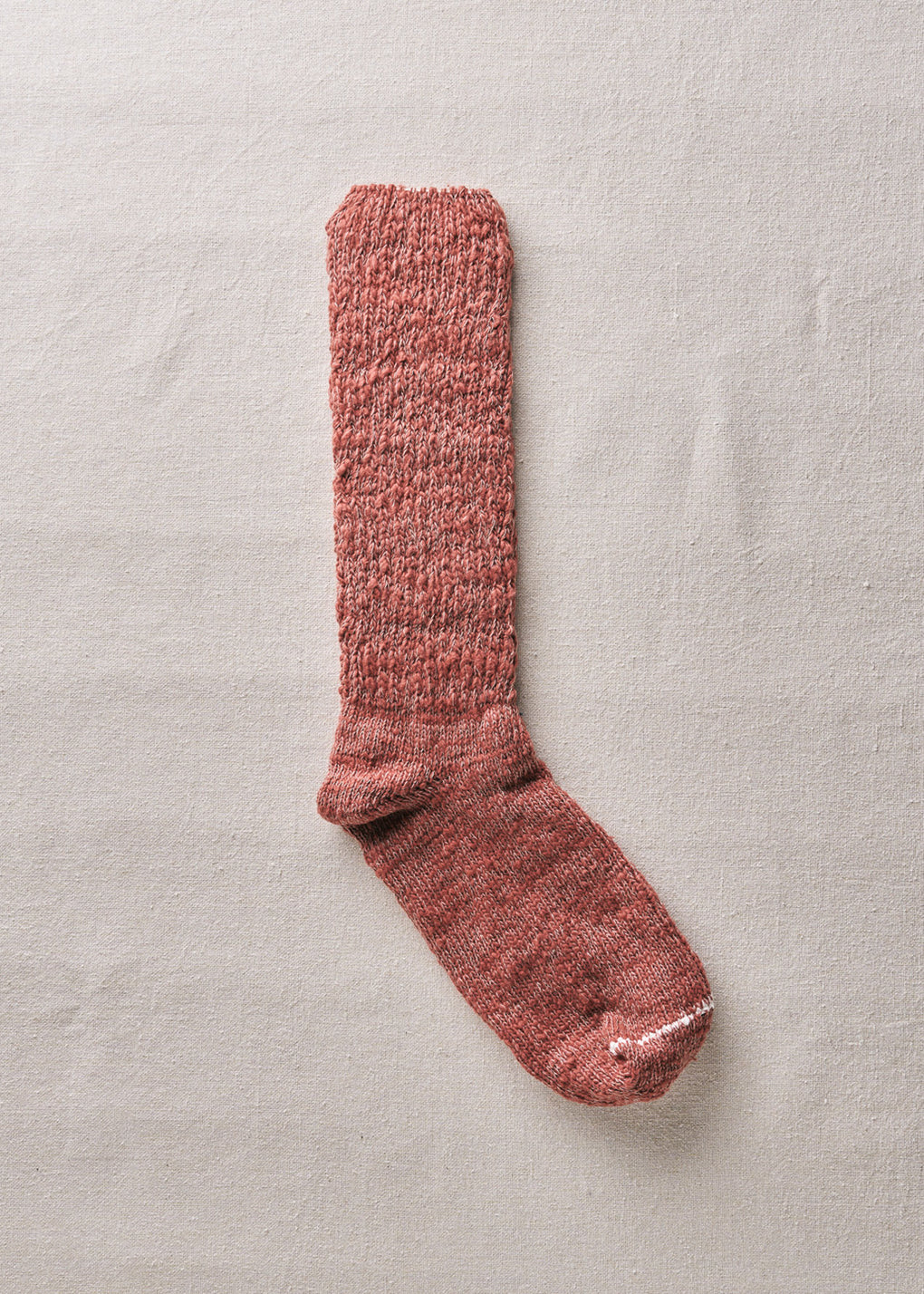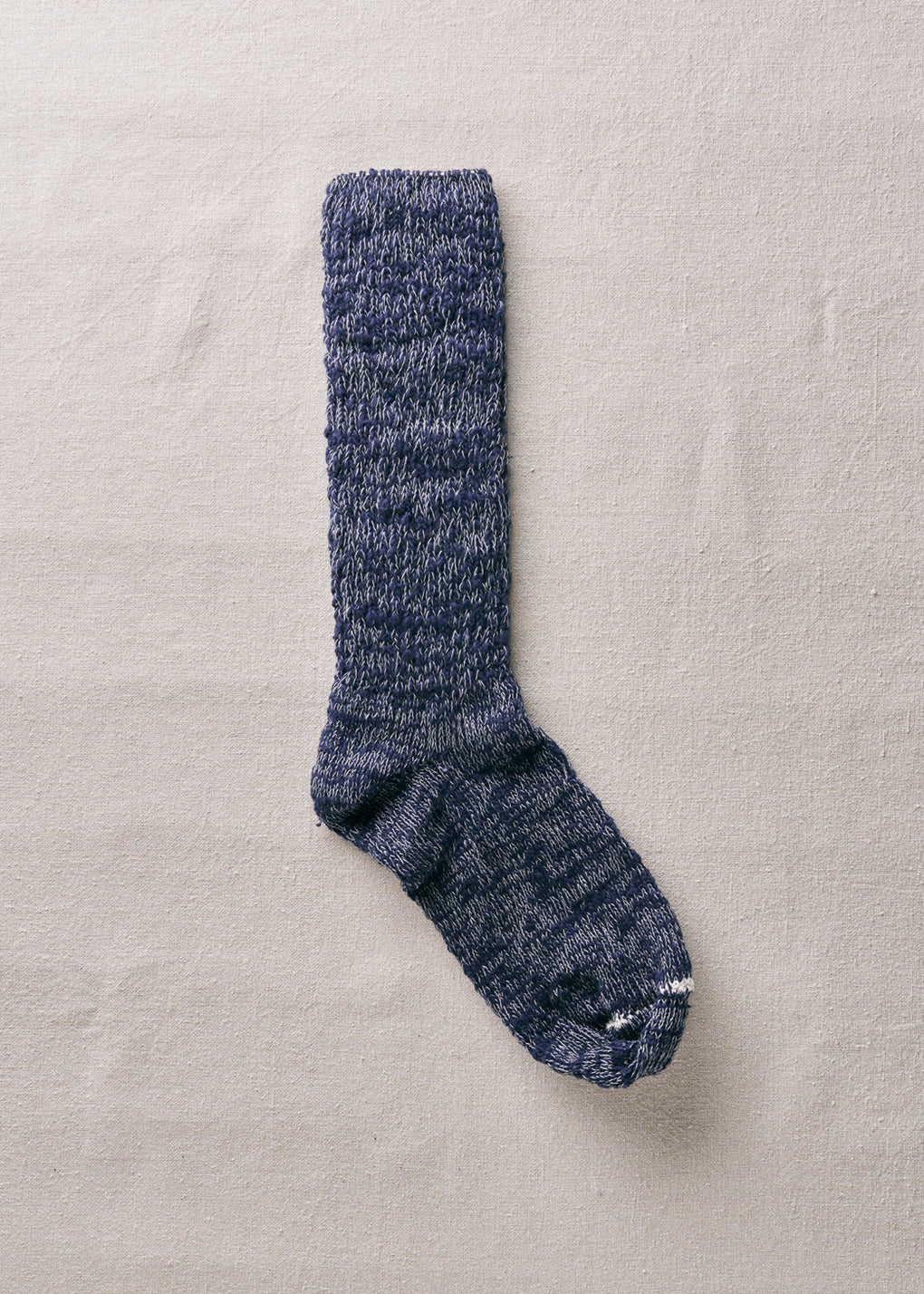 日本独自の紡績方法「ガラ紡」の糸をオリジナルカラー染めした特別な一足です。締め付けの少ない編み地で優しく編み立てているので、ルームソックスとしておうち時間に履くと心地よく毎日に寄り添ってくれます。とても豊かな風合いで、タオルのように優しく足を包み込んでくれます。