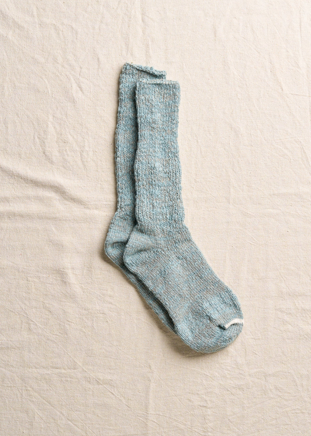 日本独自の紡績方法「ガラ紡」の糸をオリジナルカラー染めした特別な一足です。締め付けの少ない編み地で優しく編み立てているので、ルームソックスとしておうち時間に履くと心地よく毎日に寄り添ってくれます。とても豊かな風合いで、タオルのように優しく足を包み込んでくれます。