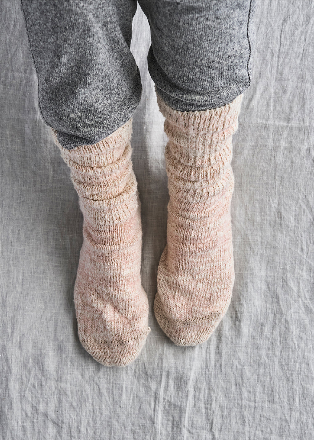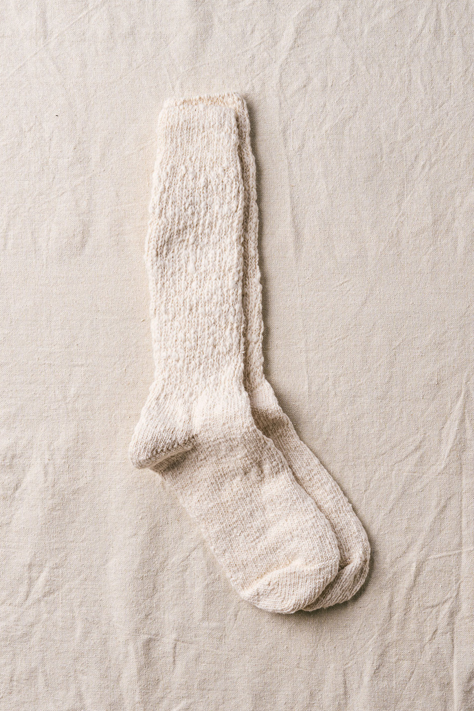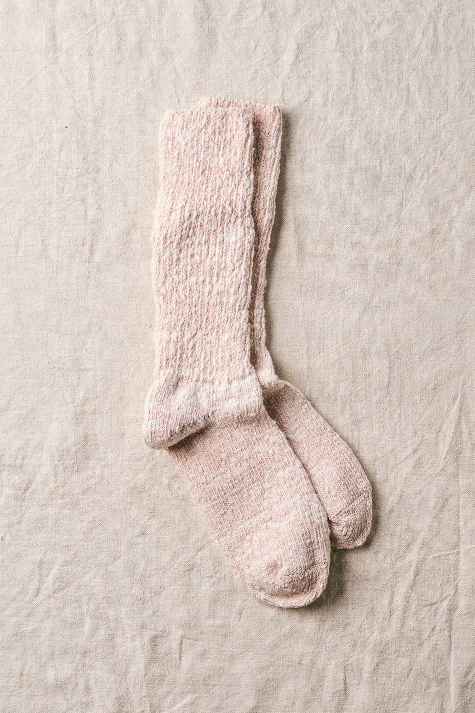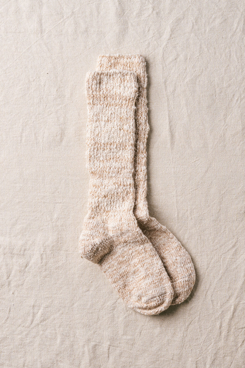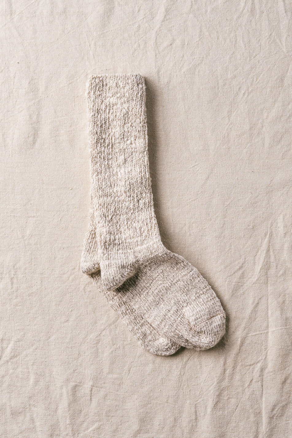 日本独自の紡績方法「ガラ紡」の糸を締め付けの少ない編み地で優しく編み立てた靴下です。ルームソックス としておうち時間に履くと心地よく毎日に寄り添ってくれます。とても豊かな風合いで、タオルのように優しく足を包み込んでくれます。