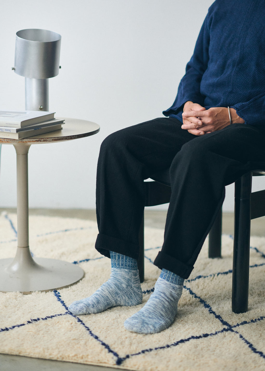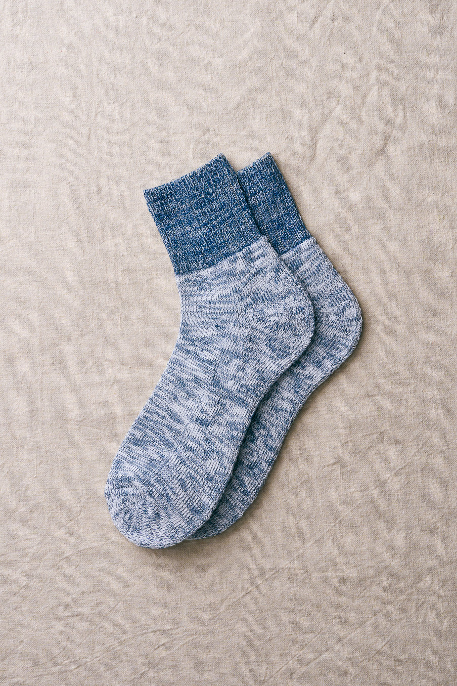 オーガニックコットンを日本で本藍染めした糸で編み立てた足底パイルのリブ編みアンクルソックス。足底のパイル編みと土踏まずのサポートゴムで快適な履き心地です。軍の靴下から着想を得た、日常使いの道具として最適な一足です。丈はくるぶしを包み込むアンクル丈です。