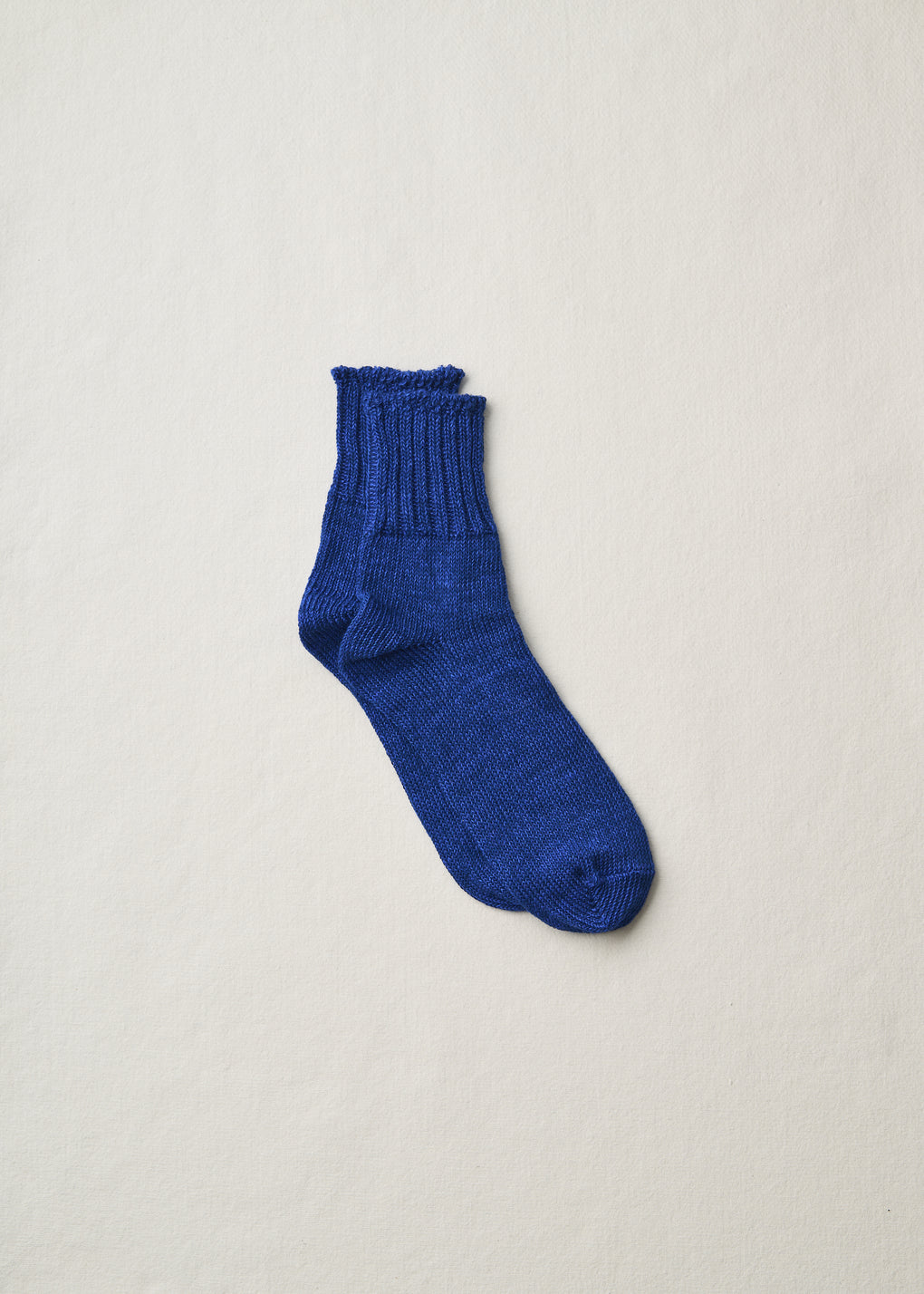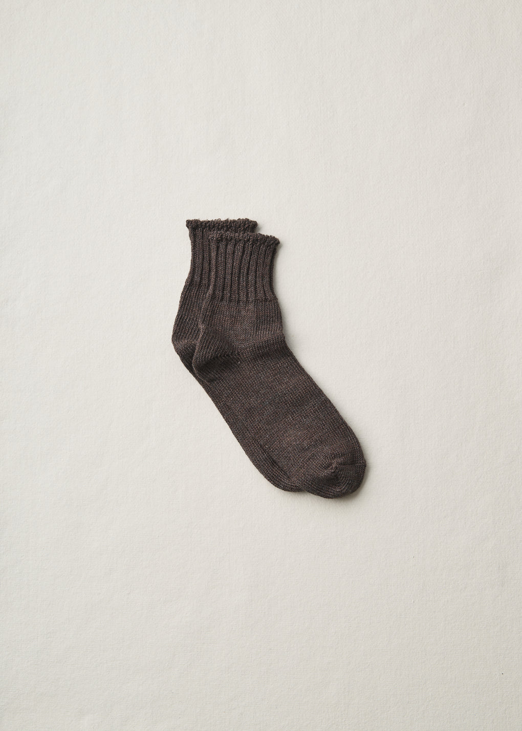 リネンとオーガニックコットンを引き揃えて編み立てたリブソックス。柔らかなコットンと清涼感のあるリネンの風合いどちらも感じられます。ローゲージの編み機でざっくりと編み立てており、快適で通気性の良い履き心地です。