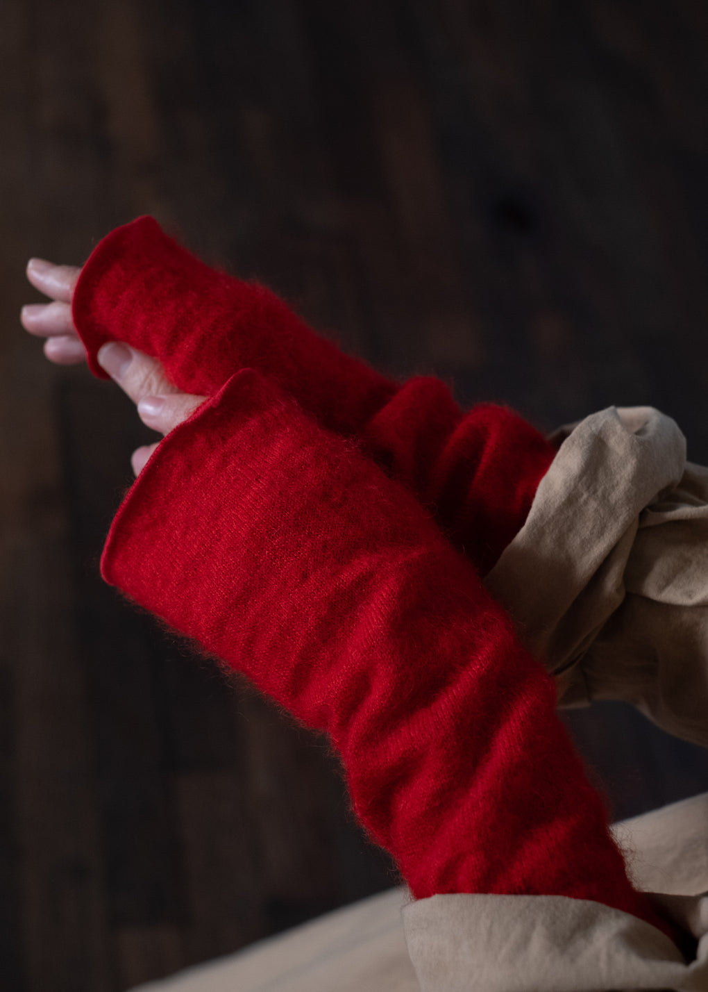 モヘアに加え、ウールとシルクをブレンドした指穴つきのアームウォーマーです。靴下の編み機を使って丁寧に編み立てられ、柔らかく心地よい肌触りが特徴です。寒い季節の手元をやさしく包み込み、上品な素材感をお楽しみいただけます。