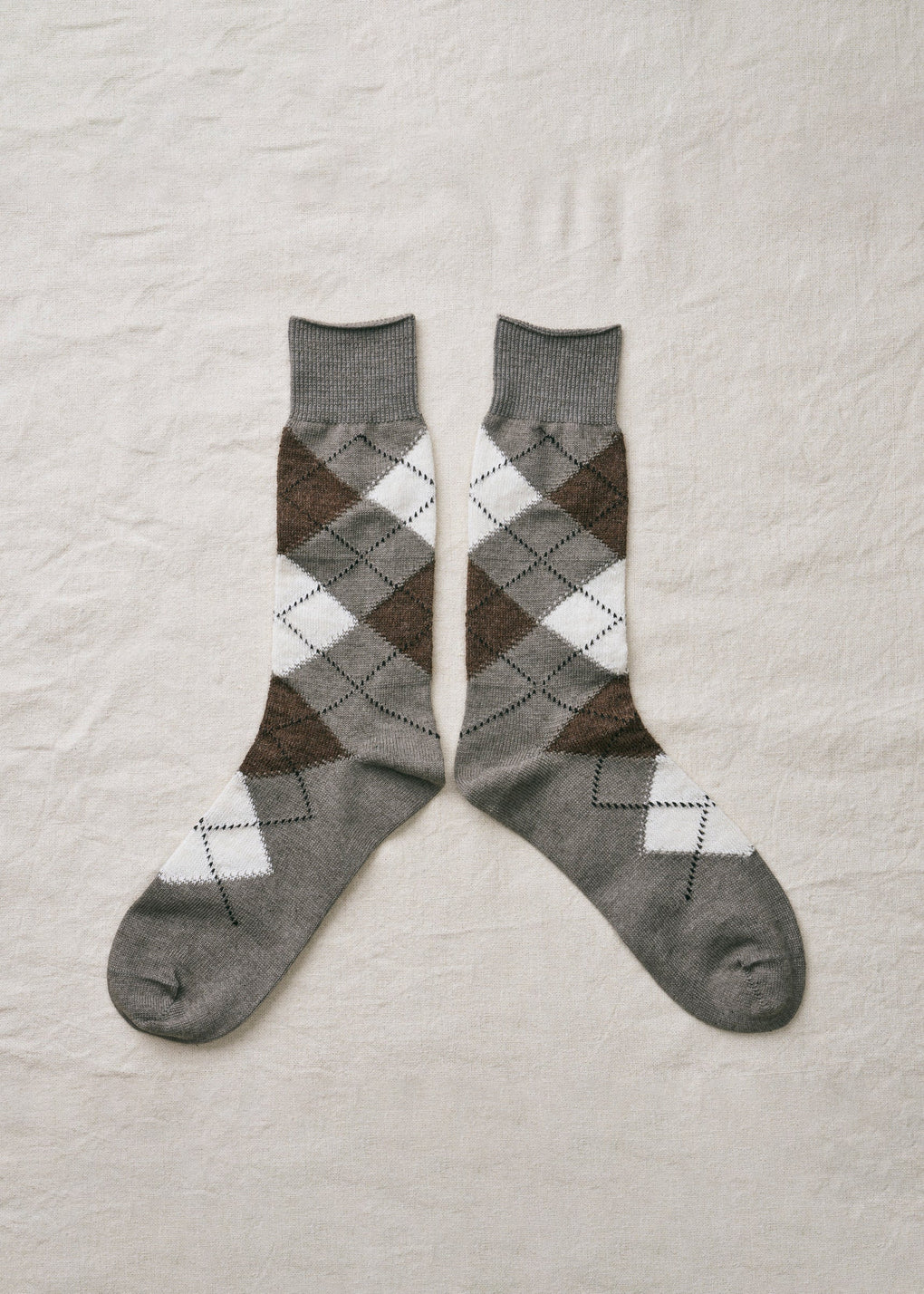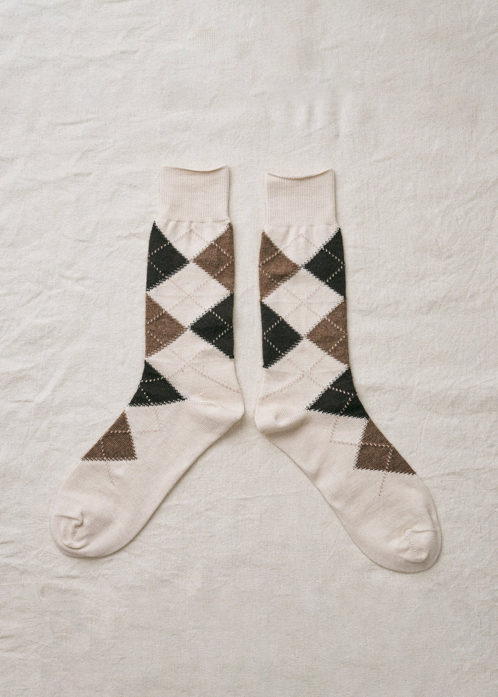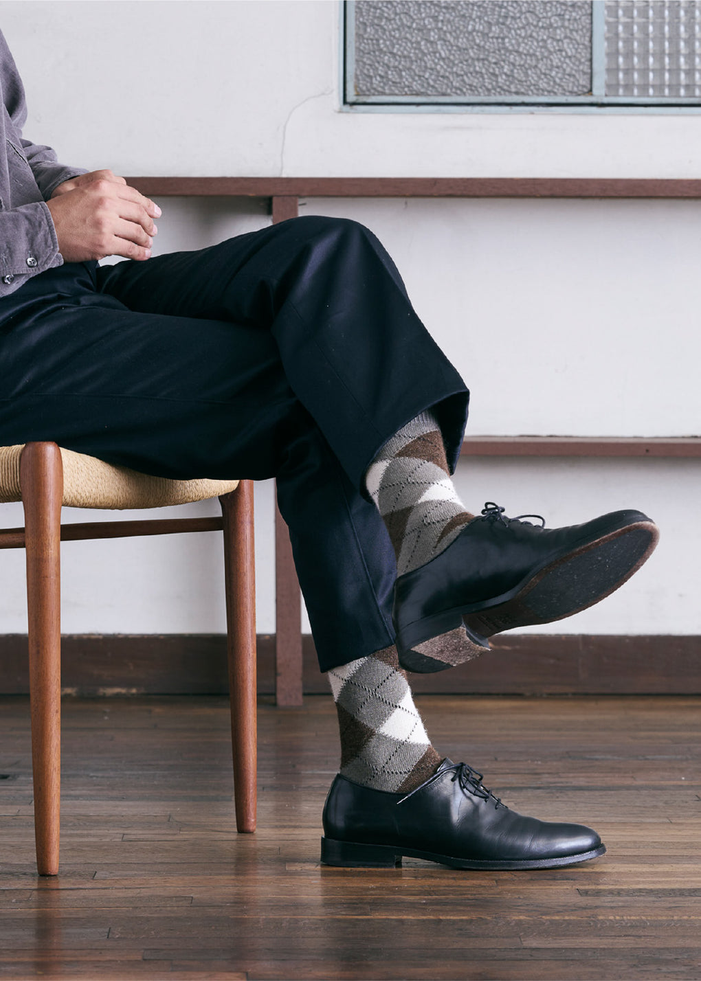 ベースにヤクとオーガニックコットン、柄にはアルパカを使用したアーガイル柄ソックスです。全て自然の色から構成される色なので、ナチュラルテイストのスタイリングのアクセントにぴったりです。爪先は凹凸の気にならないリンキングの仕様で、ビジネスにもお使いいただける上質な仕立てです。