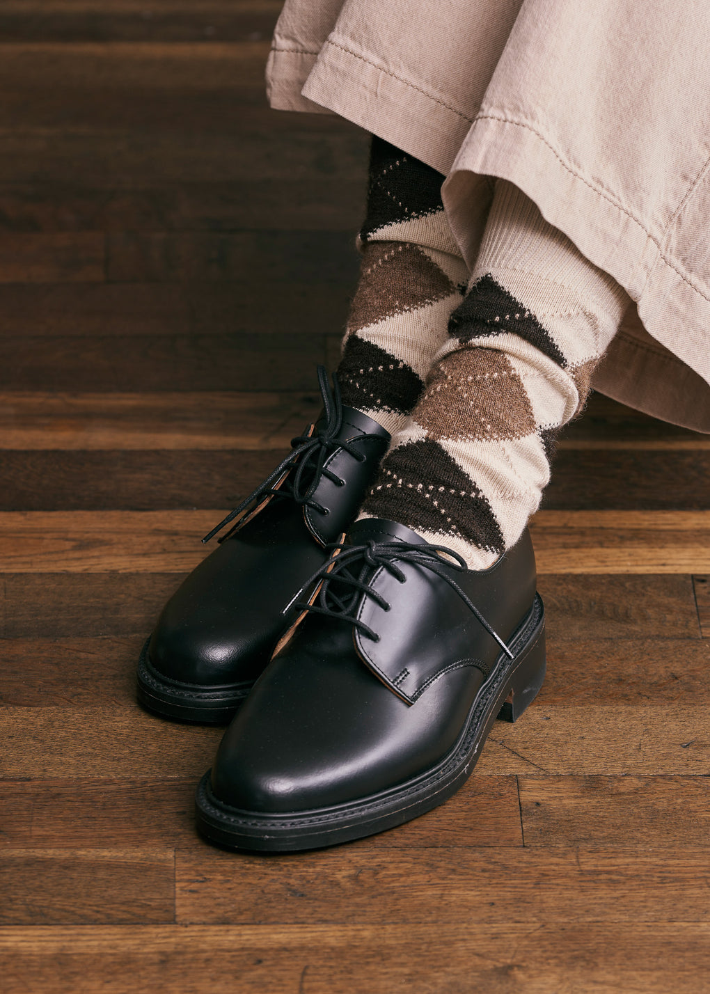 ベースにヤクとオーガニックコットン、柄にはアルパカを使用したアーガイル柄ソックスです。全て自然の色から構成される色なので、ナチュラルテイストのスタイリングのアクセントにぴったりです。爪先は凹凸の気にならないリンキングの仕様で、ビジネスにもお使いいただける上質な仕立てです。
