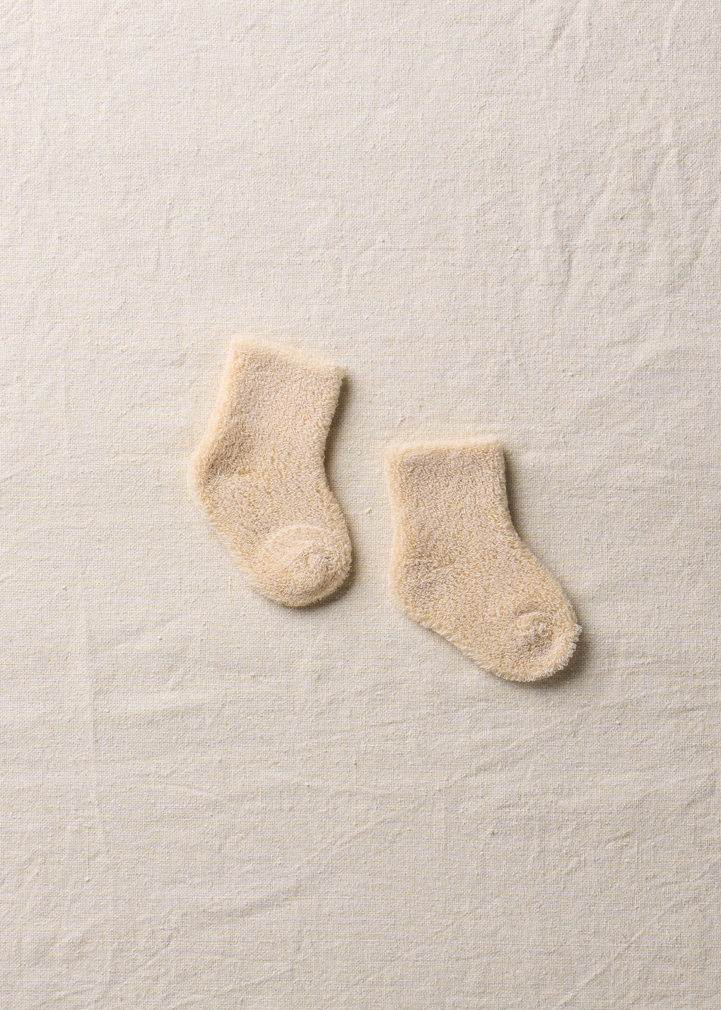 ヤクとオーガニックコットンがブレンドされた糸で編み立てたパイル編みのソックスです。ベビーへのギフトにおすすめです。