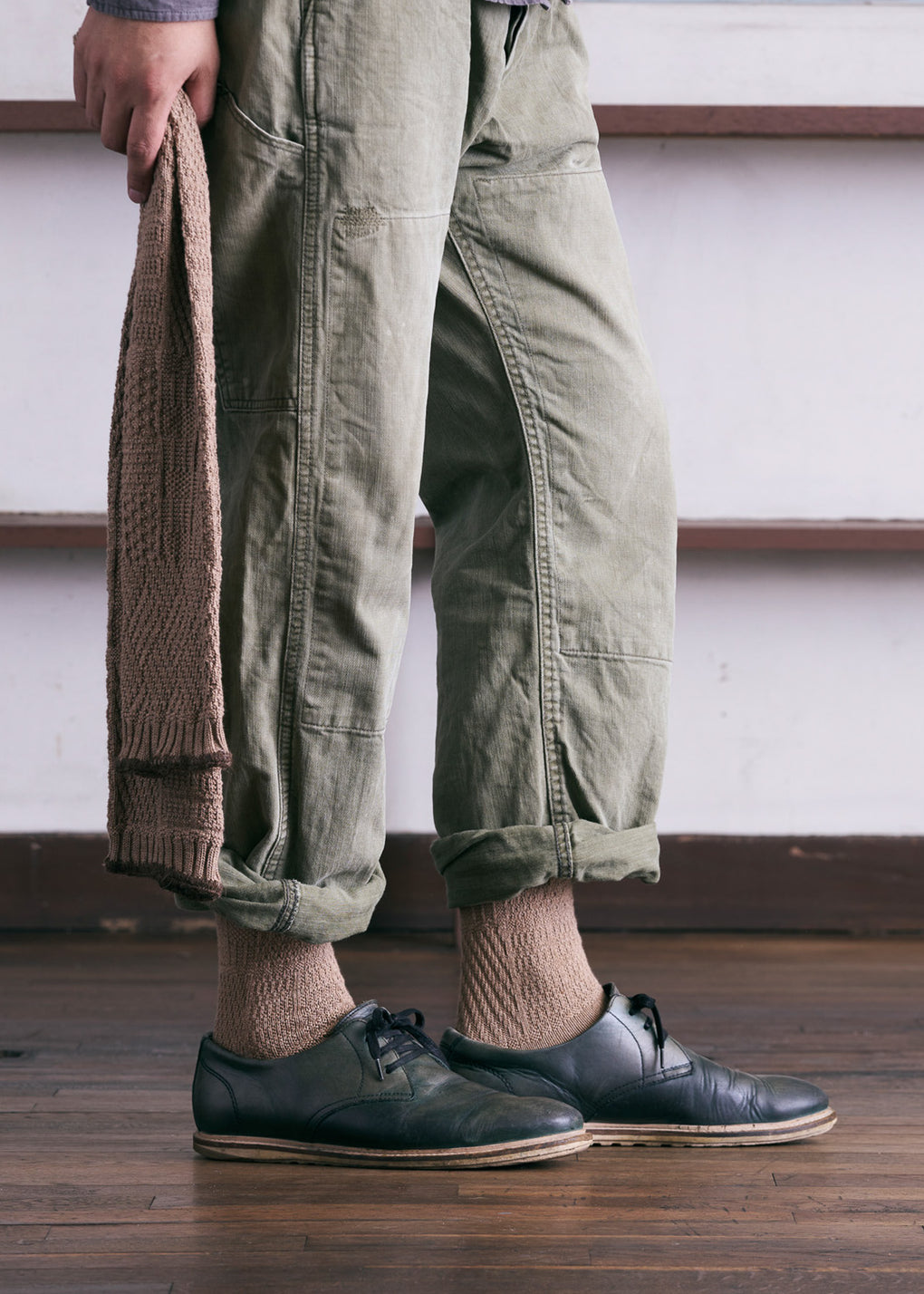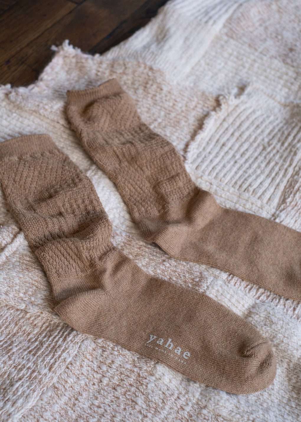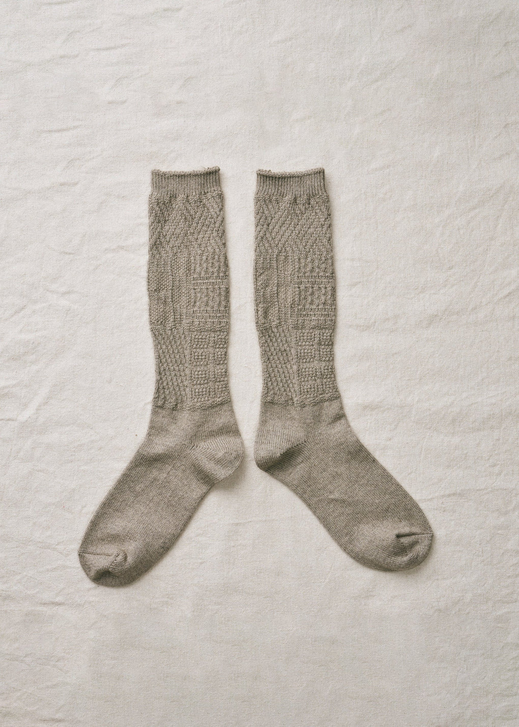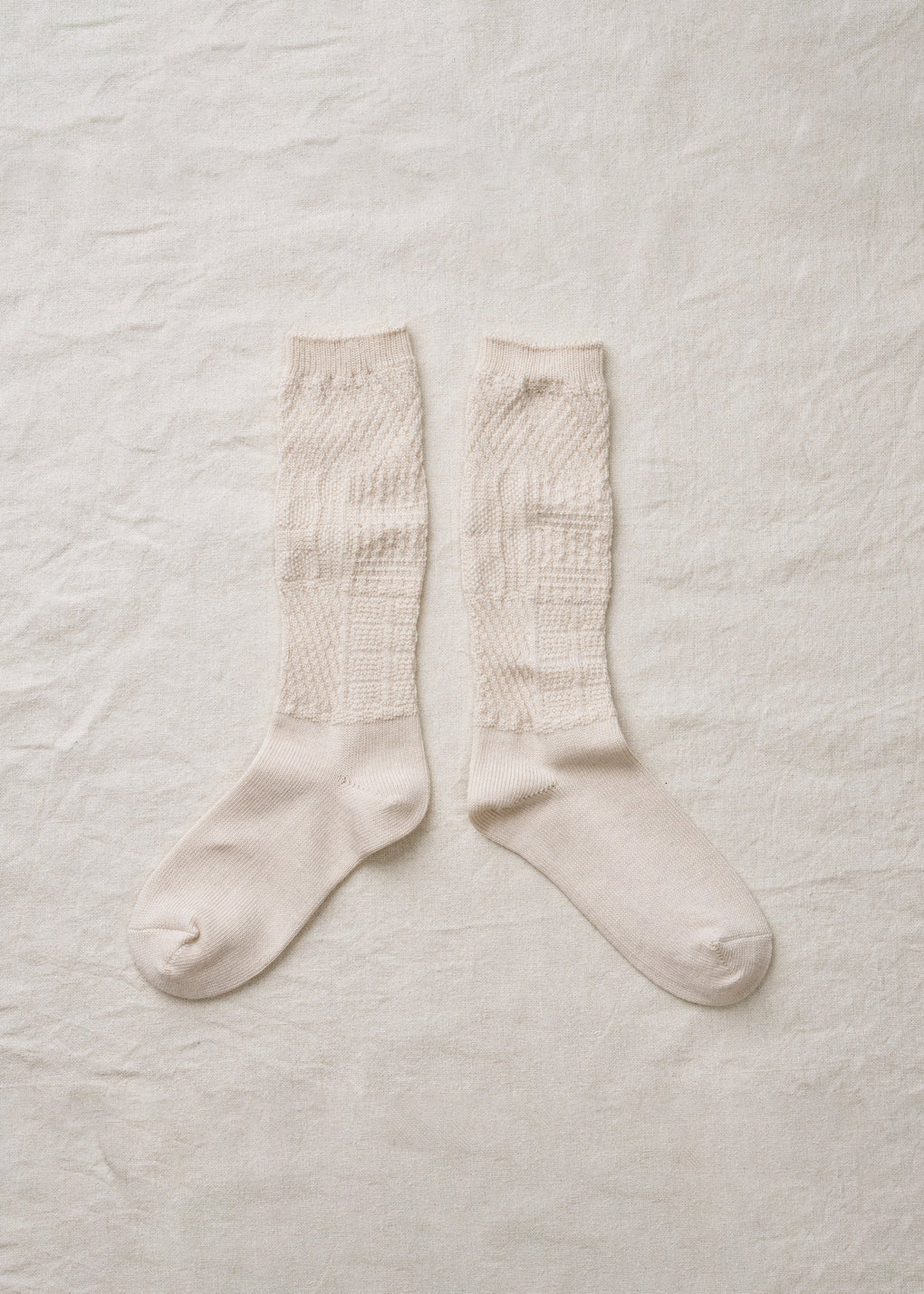 ヤクとオーガニックコットン素材で編み上げた立体的な柄の靴下です。ふくらはぎまで覆う、少し長めの丈で設計しています。様々な編み地をパッチワークのように組み合わせています。ストールと同じ柄・素材なので、ストールと合わせて統一感を持たせてスタイリングすることも可能です。