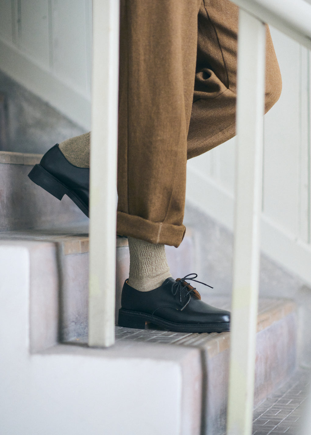 ヤクとオーガニックコットン素材で編み上げた立体的な柄の靴下です。ふくらはぎまで覆う、少し長めの丈で設計しています。様々な編み地をパッチワークのように組み合わせています。ストールと同じ柄・素材なので、ストールと合わせて統一感を持たせてスタイリングすることも可能です。