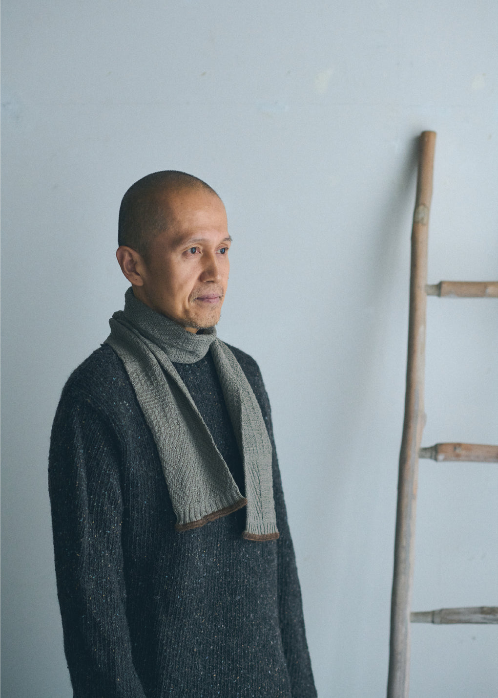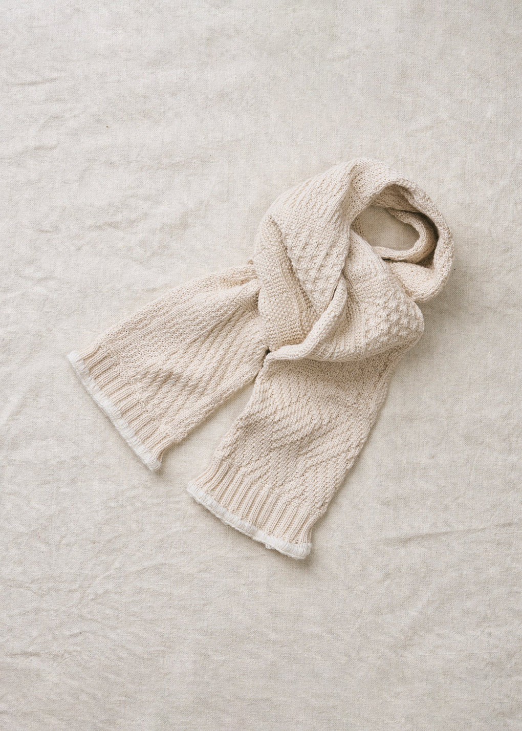 靴下編み機で表現できる様々な編み地を組み合わせたストールです。素材はヤクとオーガニックコットンです。両端はハマグリミシンという特殊な旧式ミシンで縫製し、デザインのアクセントにしています。軽い着用感で、初秋の少し冷える時期や、室内での使用にもぴったりです。