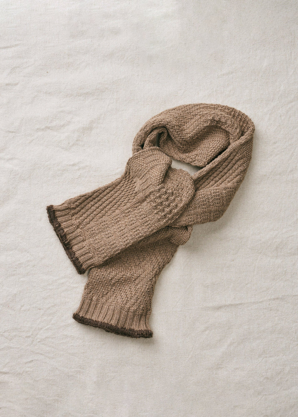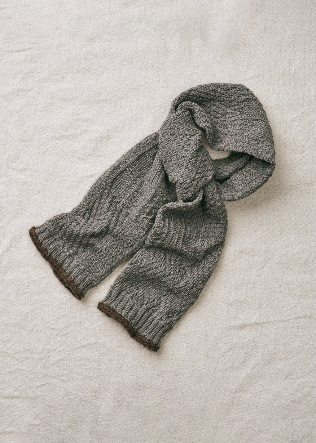 靴下編み機で表現できる様々な編み地を組み合わせたストールです。素材はヤクとオーガニックコットンです。両端はハマグリミシンという特殊な旧式ミシンで縫製し、デザインのアクセントにしています。軽い着用感で、初秋の少し冷える時期や、室内での使用にもぴったりです。
