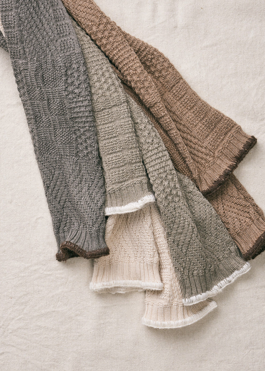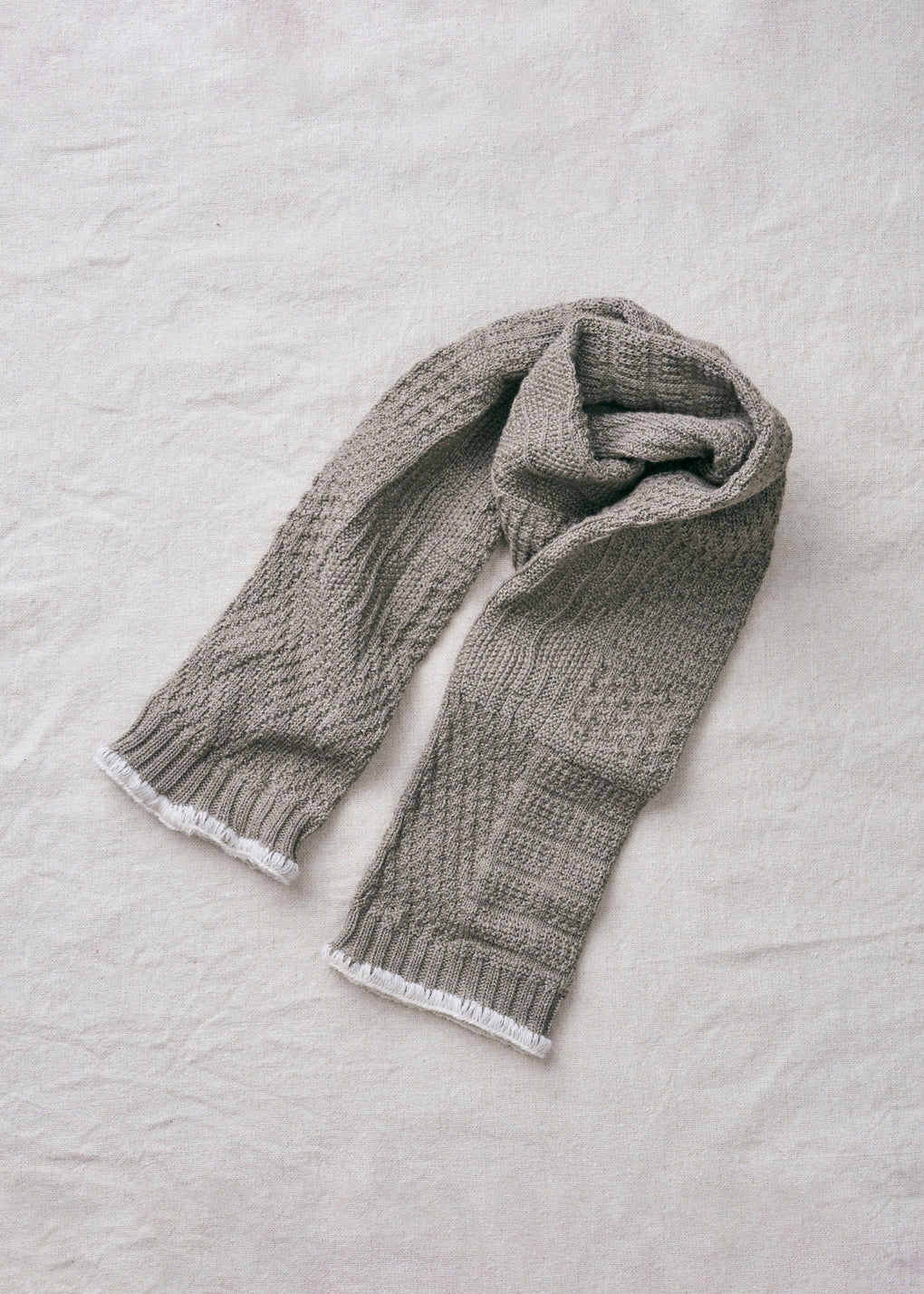 靴下編み機で表現できる様々な編み地を組み合わせたストールです。素材はヤクとオーガニックコットンです。両端はハマグリミシンという特殊な旧式ミシンで縫製し、デザインのアクセントにしています。軽い着用感で、初秋の少し冷える時期や、室内での使用にもぴったりです。