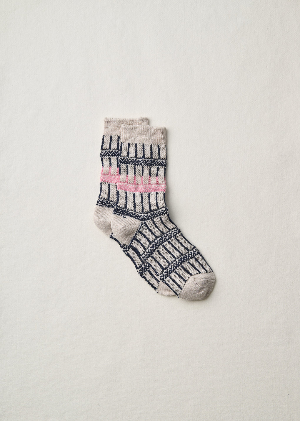 オーガニックコットンで編み立てた変則的なストライプ柄のソックス。ベース部分はランダムに太い部分があるスラブ糸を使い編み立てているため、柔らかな表情のある編地です。縦縞の途中に入る柄と切り替えがユニークな印象を与えます。