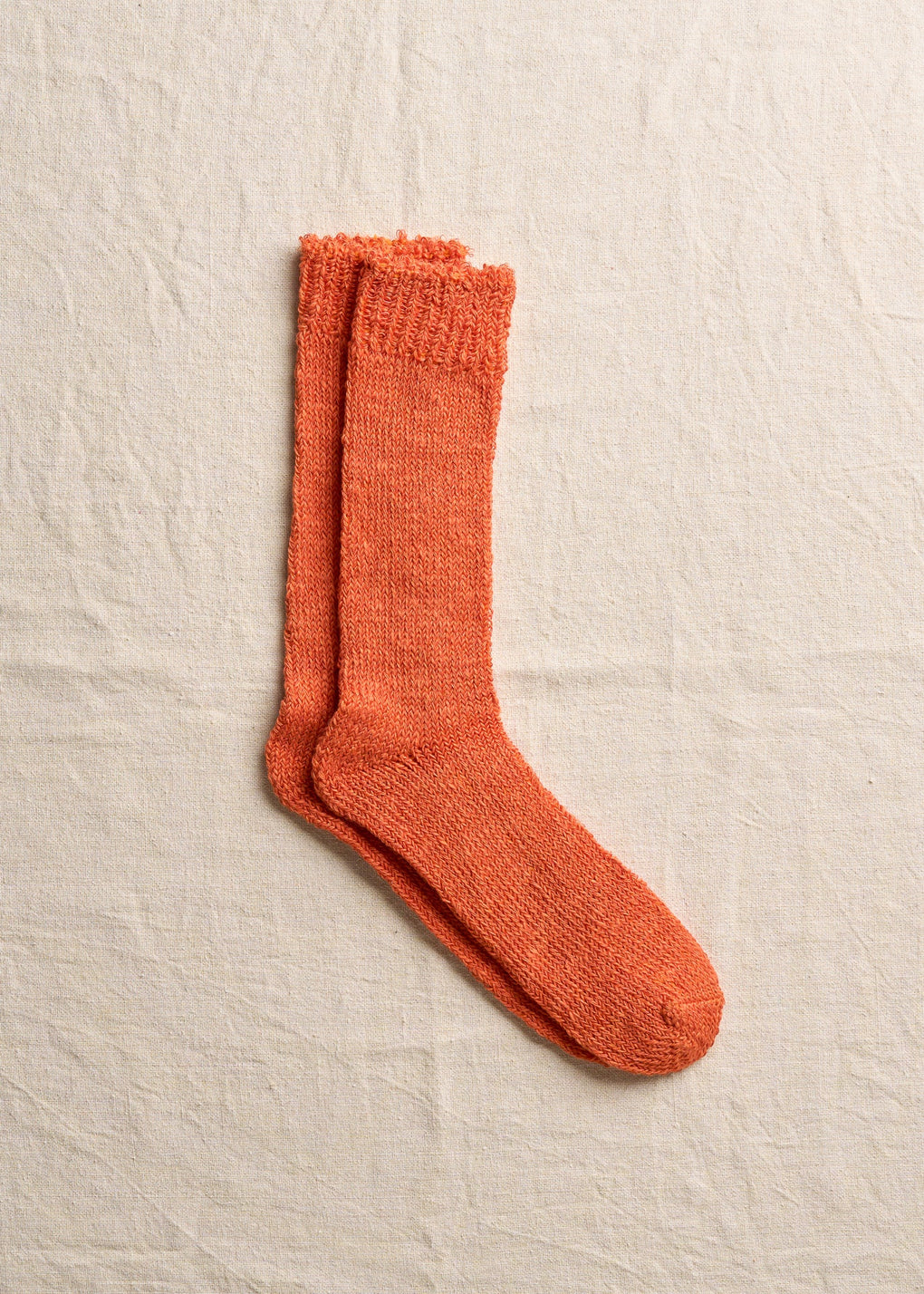 オーガニックコットンとリネンを引き揃えて編み立てたプレーンソックス。イギリスのベントレー社製の古いヴィンテージマシーンでざっくりと編み立てており、伸びが良く、快適で通気性の良い履き心地です。