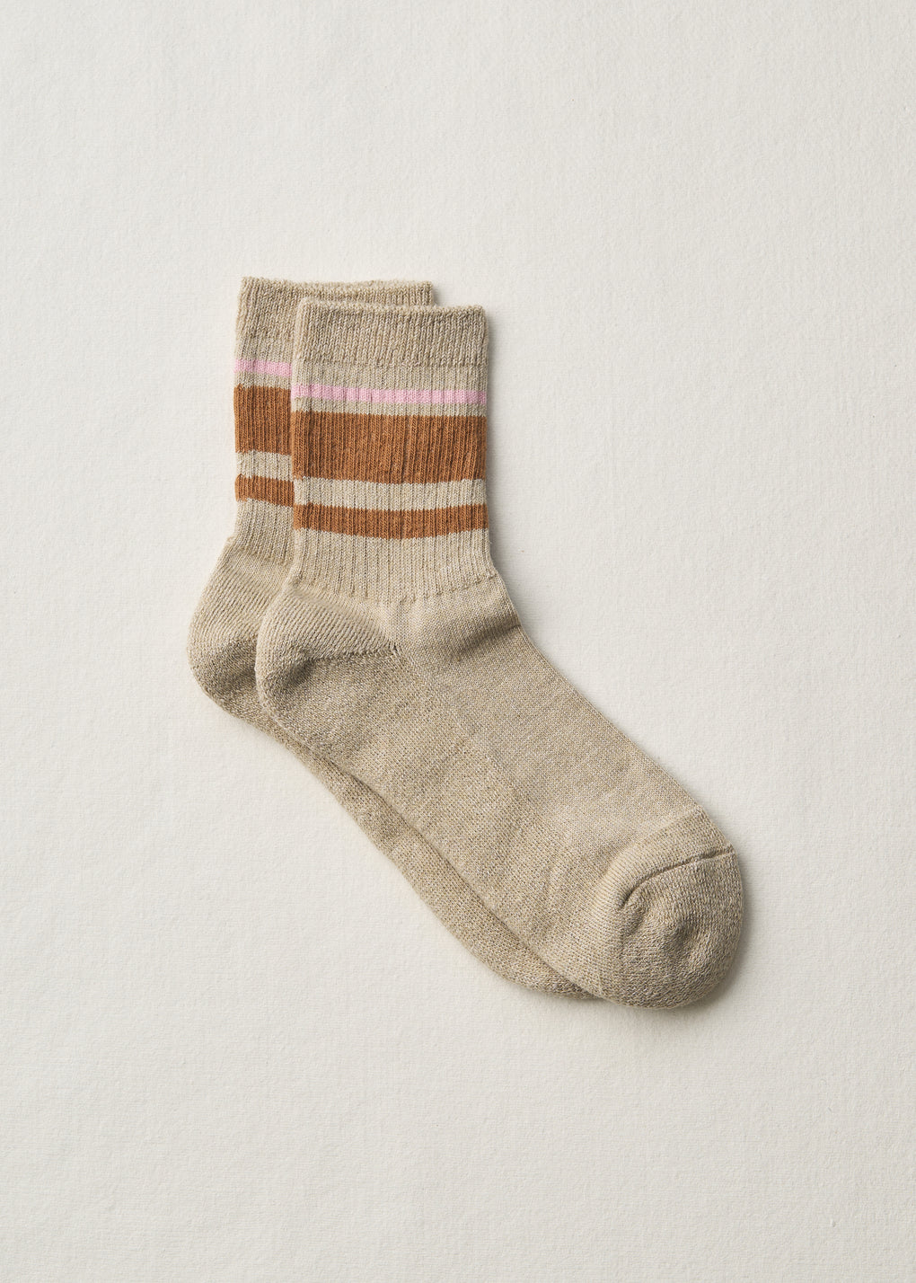 リネンとオーガニックコットンを撚糸した糸で編み立てた足底パイルソックス。コットンの柔らかさとリネンの清涼感を共に感じられるように、撚糸した糸で編み立てています。