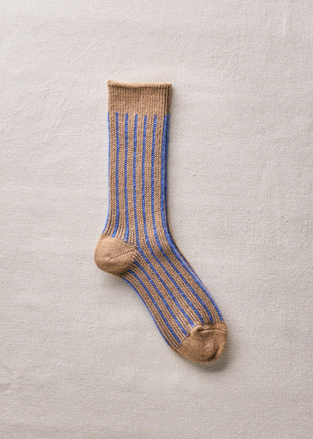 ベースにカラードオーガニックコットンを使用し、ストライプ柄にモヘアをあしらったソックス。ローゲージの編み機でざっくりと編み立てたことで、ナチュラルな風合いと柔らかな履き心地を実現しました。素材の個性が引き立つデザインで、足元にさりげないアクセントを加えます。