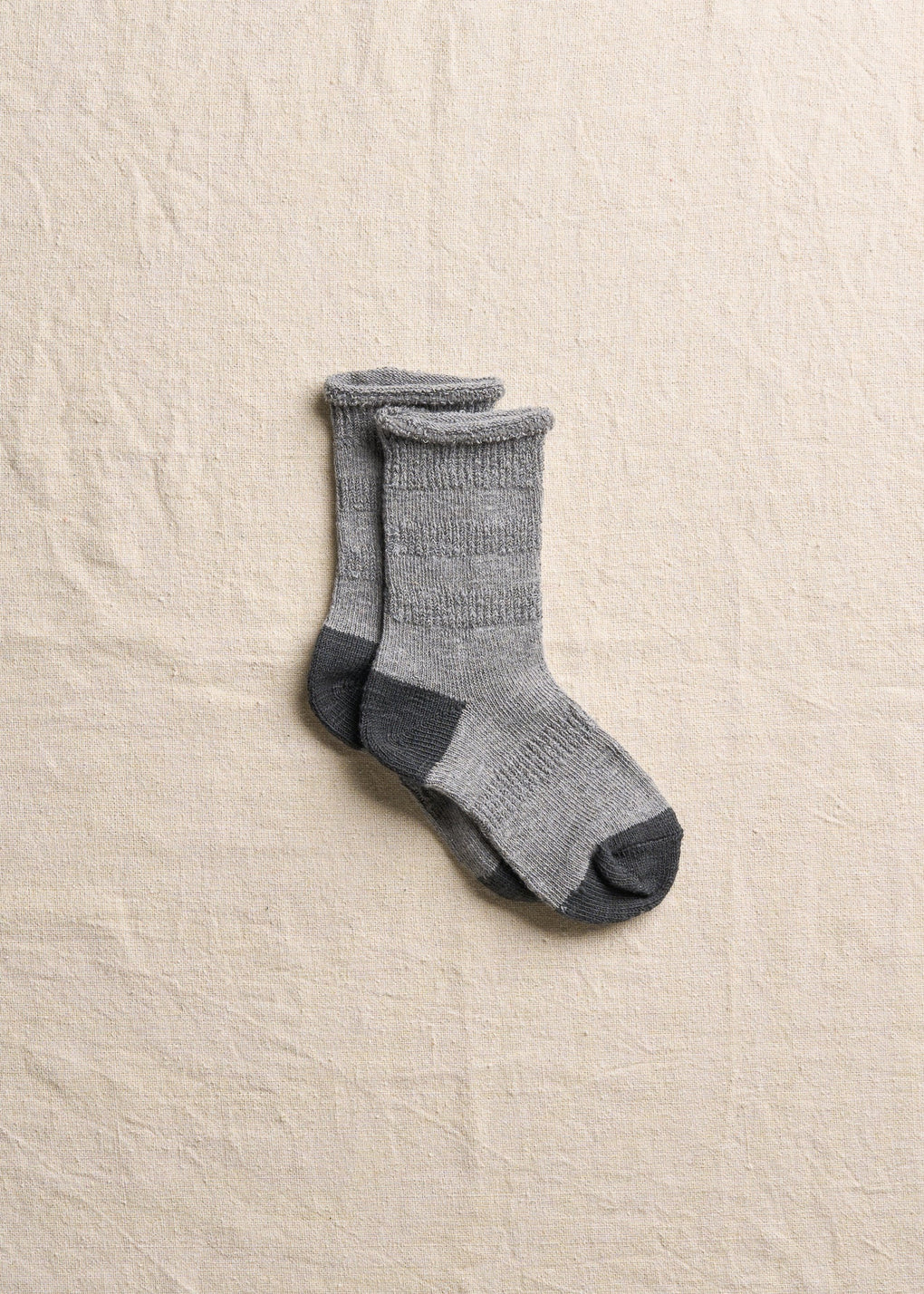 オーガニックコットンでざっくりと編み立てたキッズサイズのローゲージソックス。厚手でコットンの柔らかな風合いが楽しめます。部分的に入ったサポートのゴム入れでキッズにも優しくフィットします。