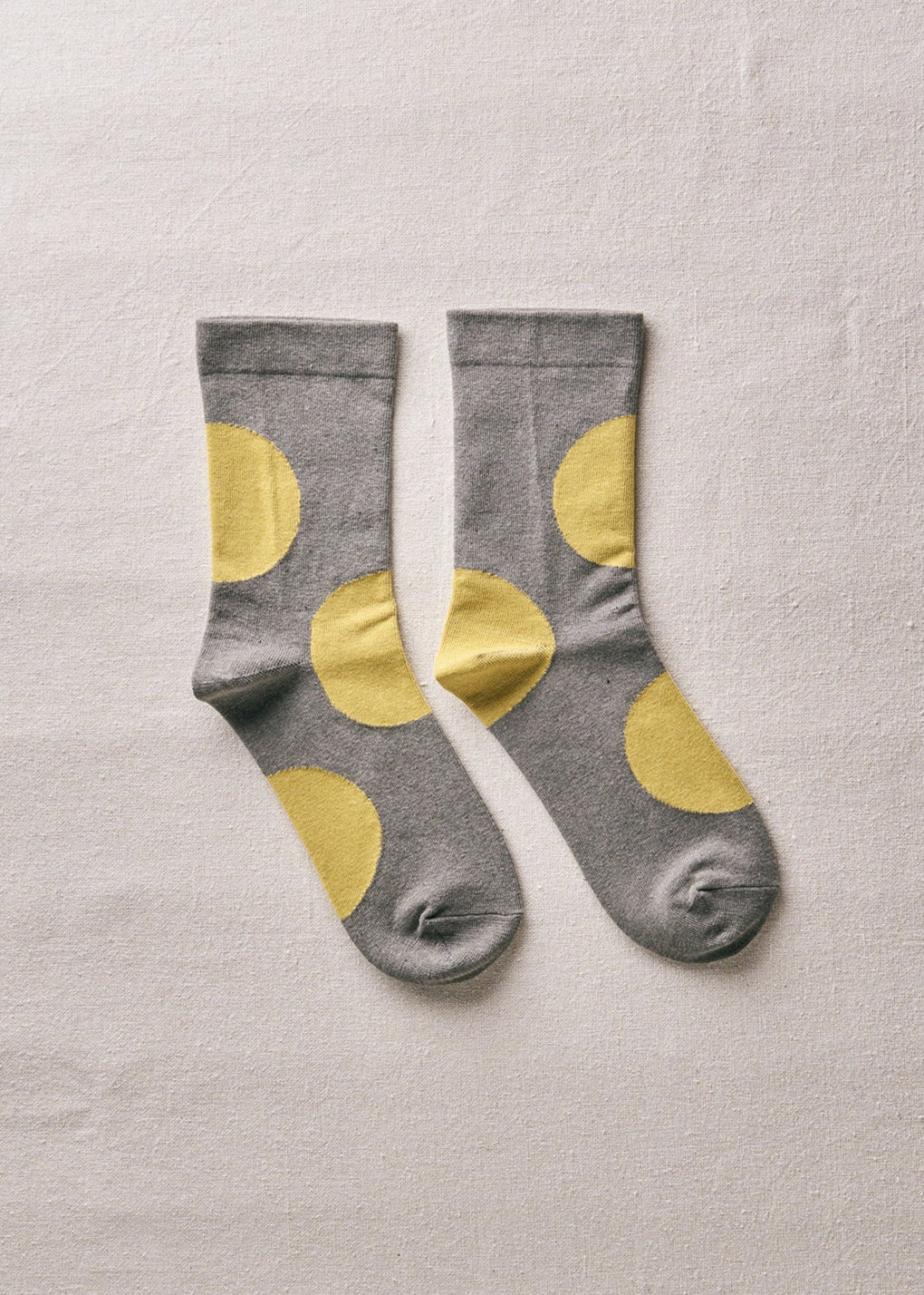 オーガニックコットンで編み立てた大きなドットが印象的なミドルゲージソックス。履き口はゴムなしです。両足の左右それぞれでドットの位置を変えたアシンメトリー柄なのでいろいろな角度からドットを楽しめます。