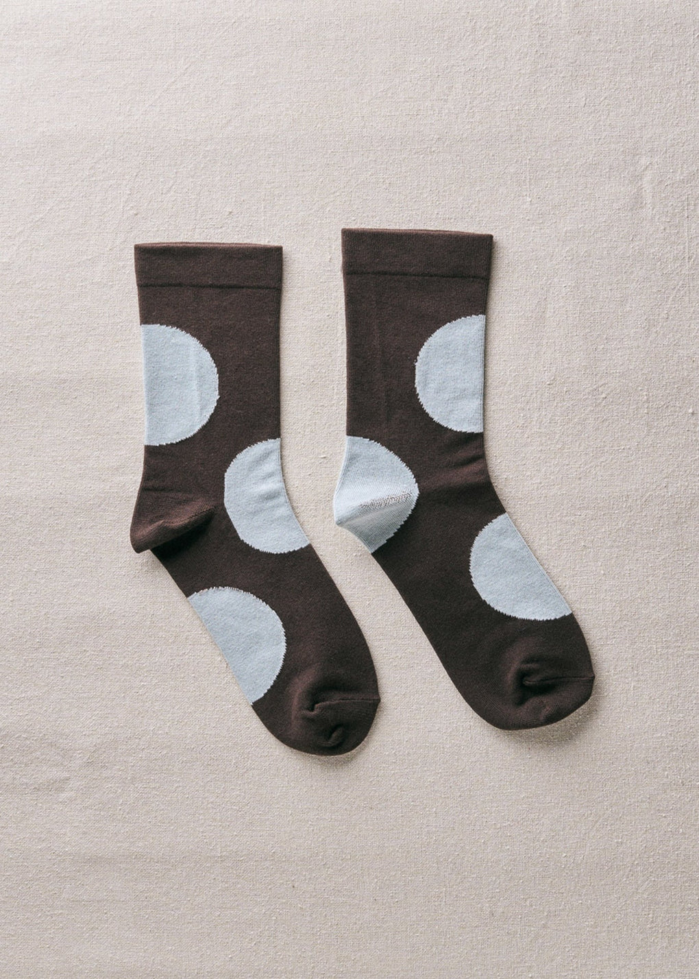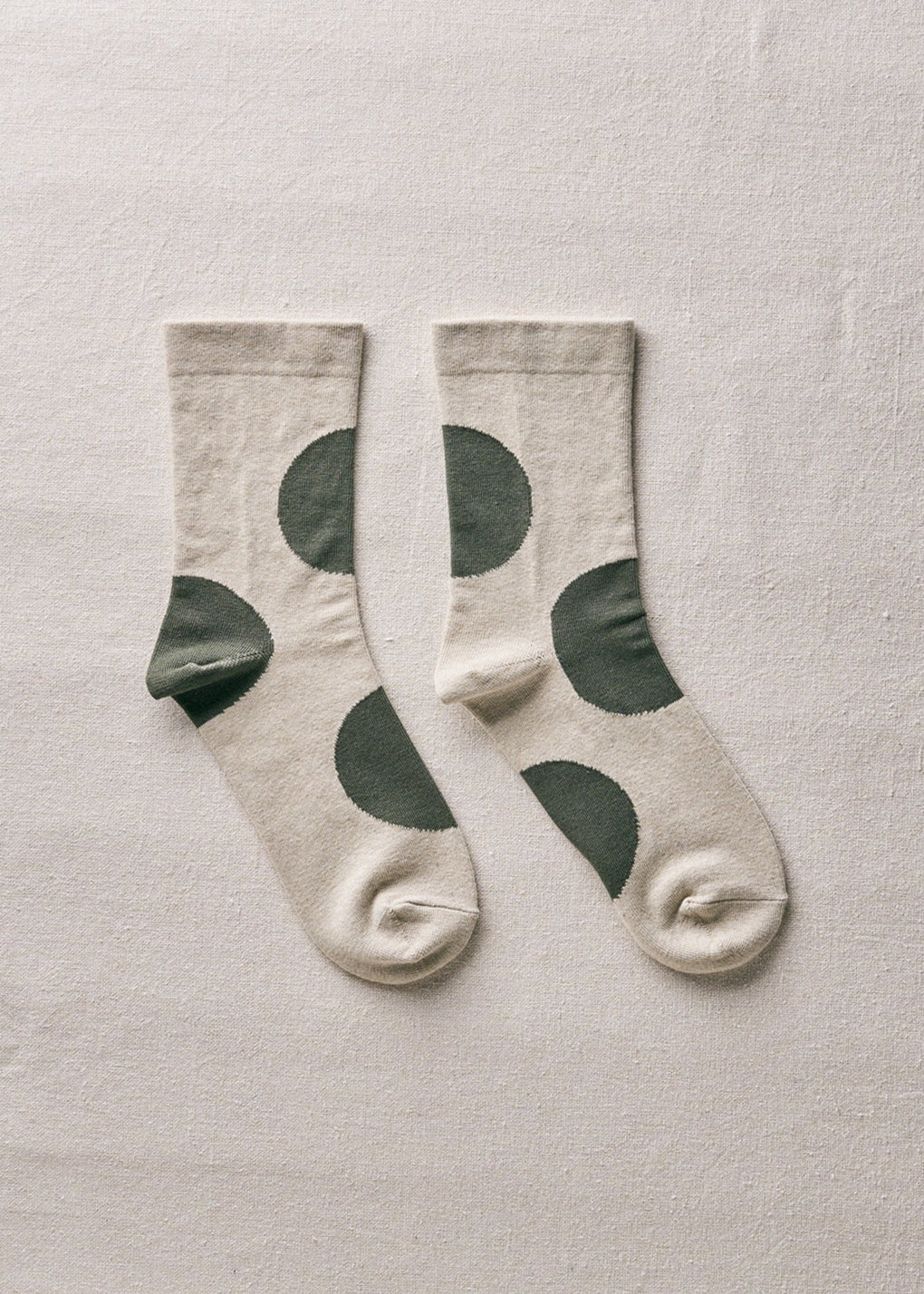 オーガニックコットンで編み立てた大きなドットが印象的なミドルゲージソックス。履き口はゴムなしです。両足の左右それぞれでドットの位置を変えたアシンメトリー柄なのでいろいろな角度からドットを楽しめます。