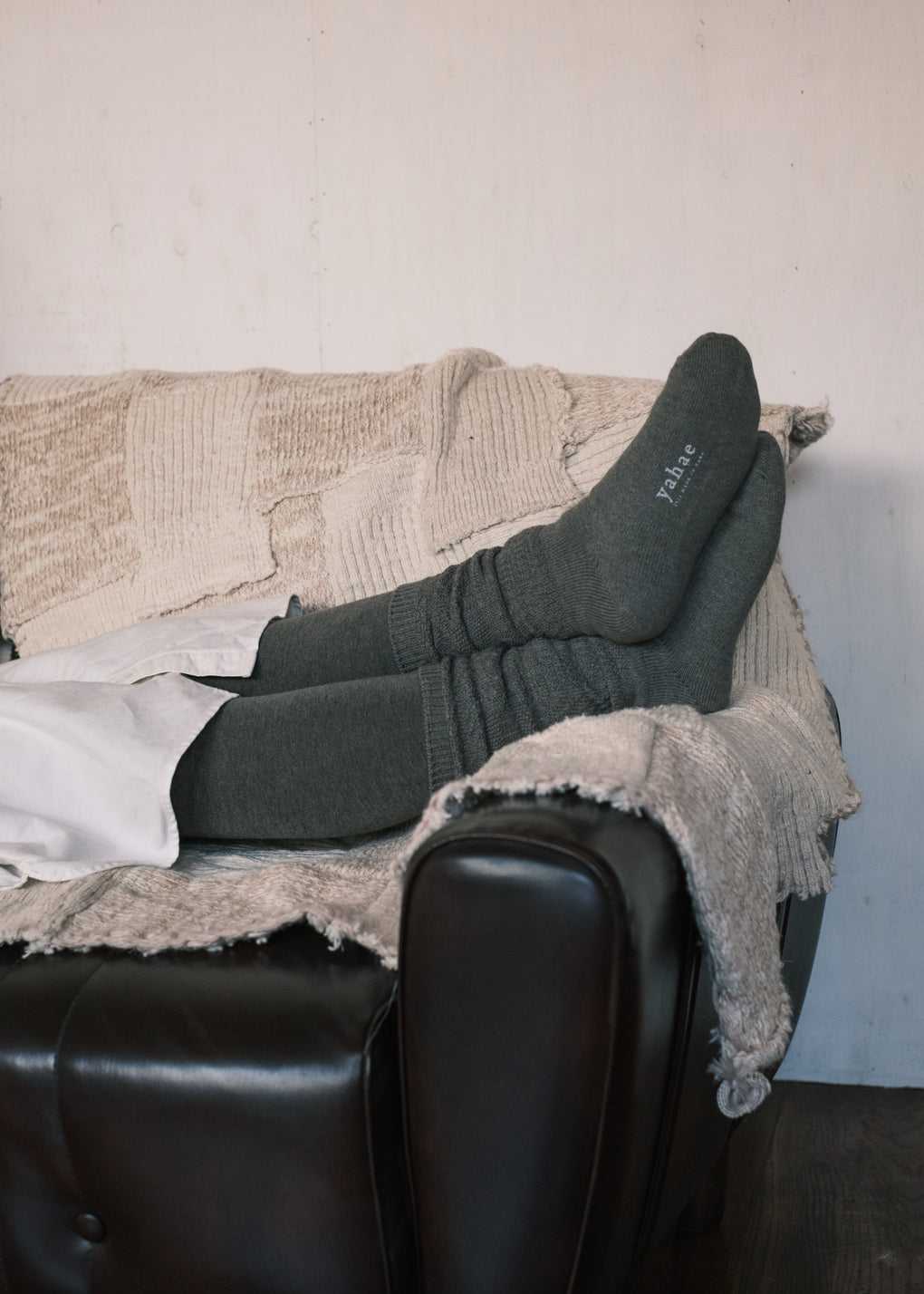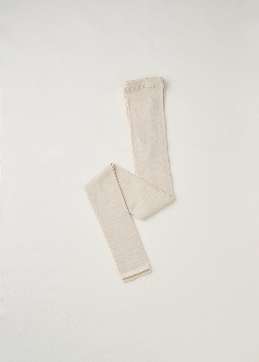 オーガニックコットンとヤクの混紡糸で編み立てた伸びの良いプレーンレギンス。オールシズンはける薄手の編地です。腰までしっかりと覆う深めの股上で、足首に余裕のある長めの12 分丈に仕上げました。