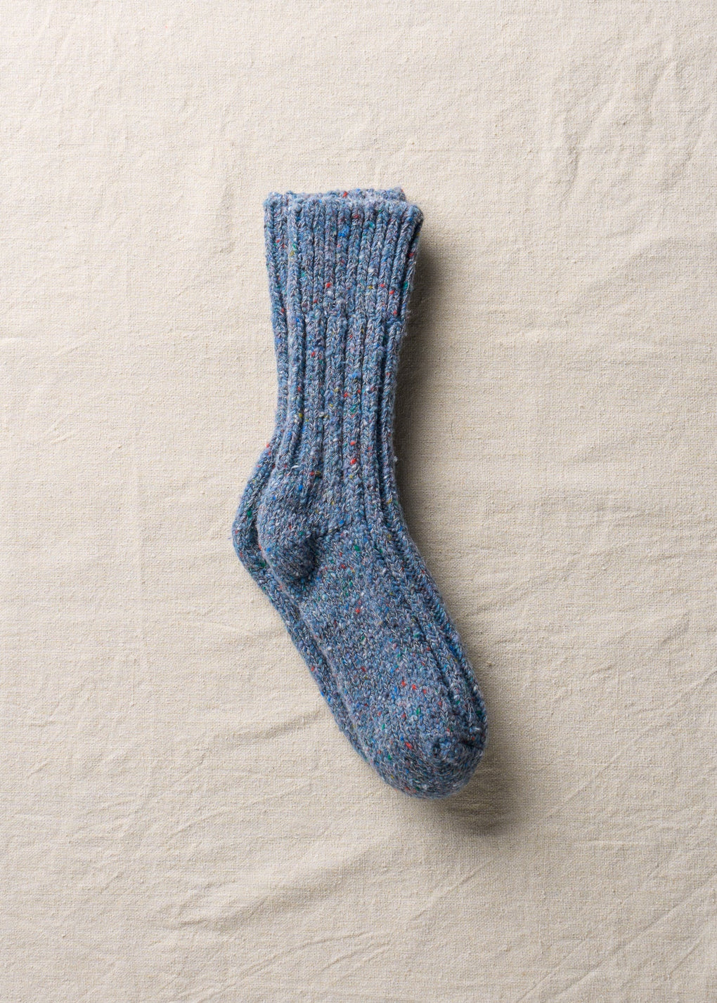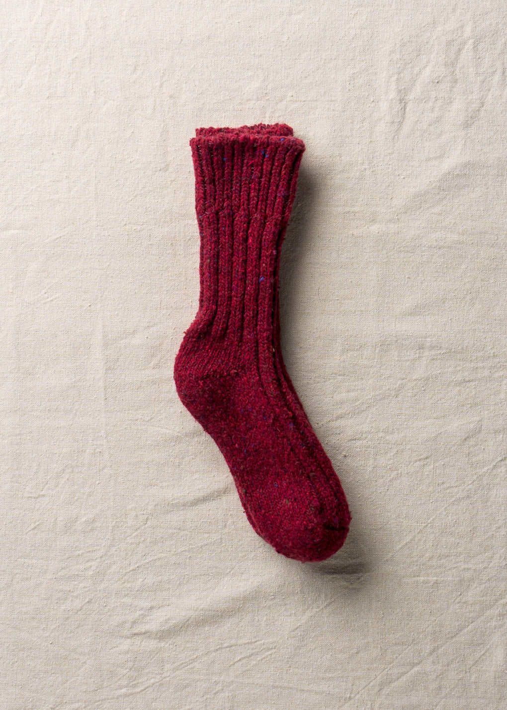 リサイクルウールで編み立てたローゲージソックス。英国の旧式ヴィンテージマシーンで編み立てています。たくさんの糸を使いゆっくりと編み上げた、手編みのような優しい履き心地です。