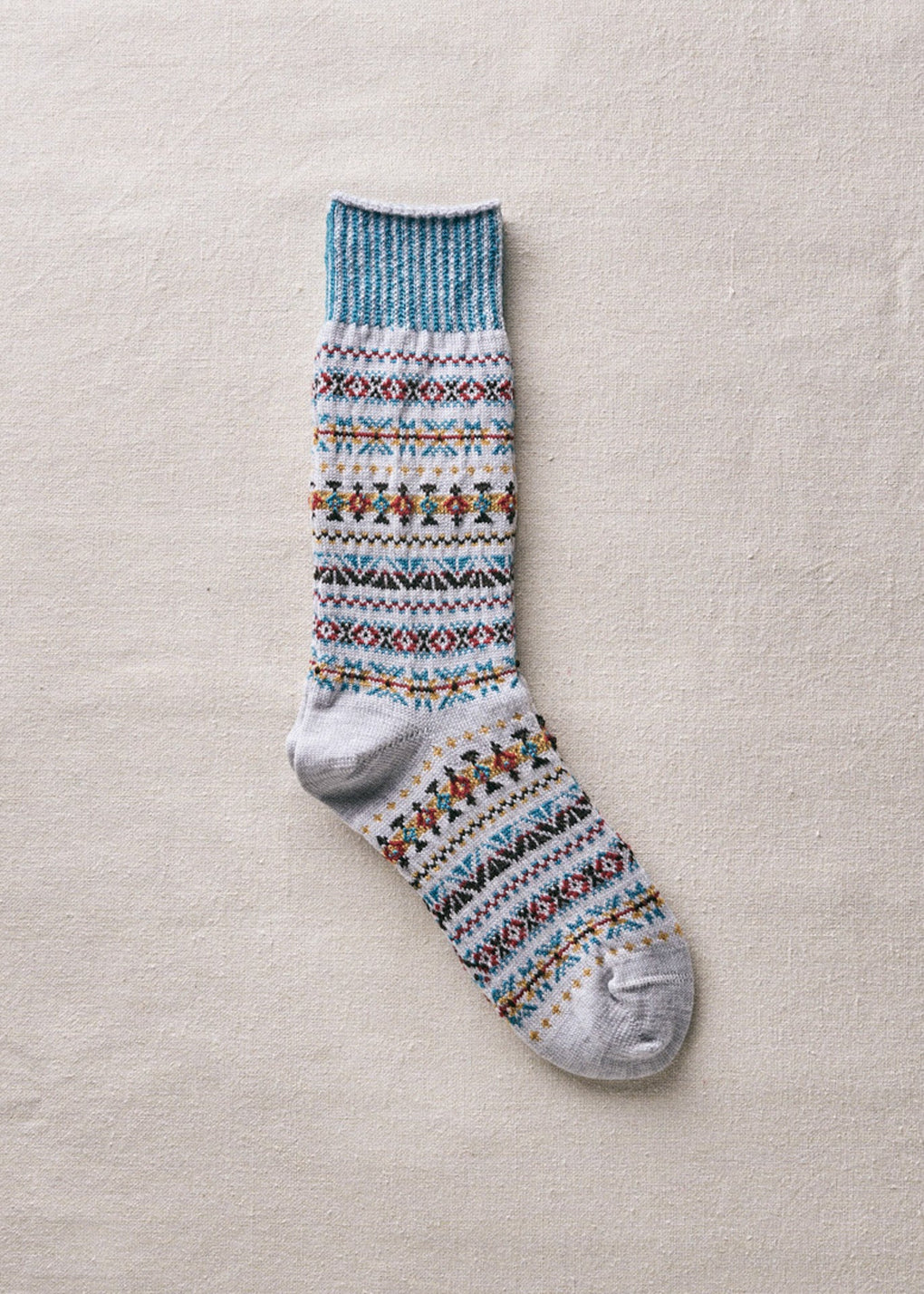 色鮮やかな幾何学模様が特徴の、伝統的なフェアアイル柄をXマシーンで編み立てました。滑らかで肌触りの良い梳毛のウールを使用し、温もりを感じる一足です。