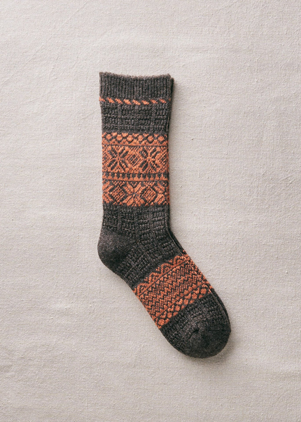空気を多く含んだ膨らみのある紡毛と滑らかな梳毛のウールをミックスして編み立てたノルディック柄ソックス。北欧の自然をイメージした雪の結晶のデザインが特徴で、温かみのある風合いと快適な履き心地をお楽しみいただけます。寒い季節にぴったりの一足です。