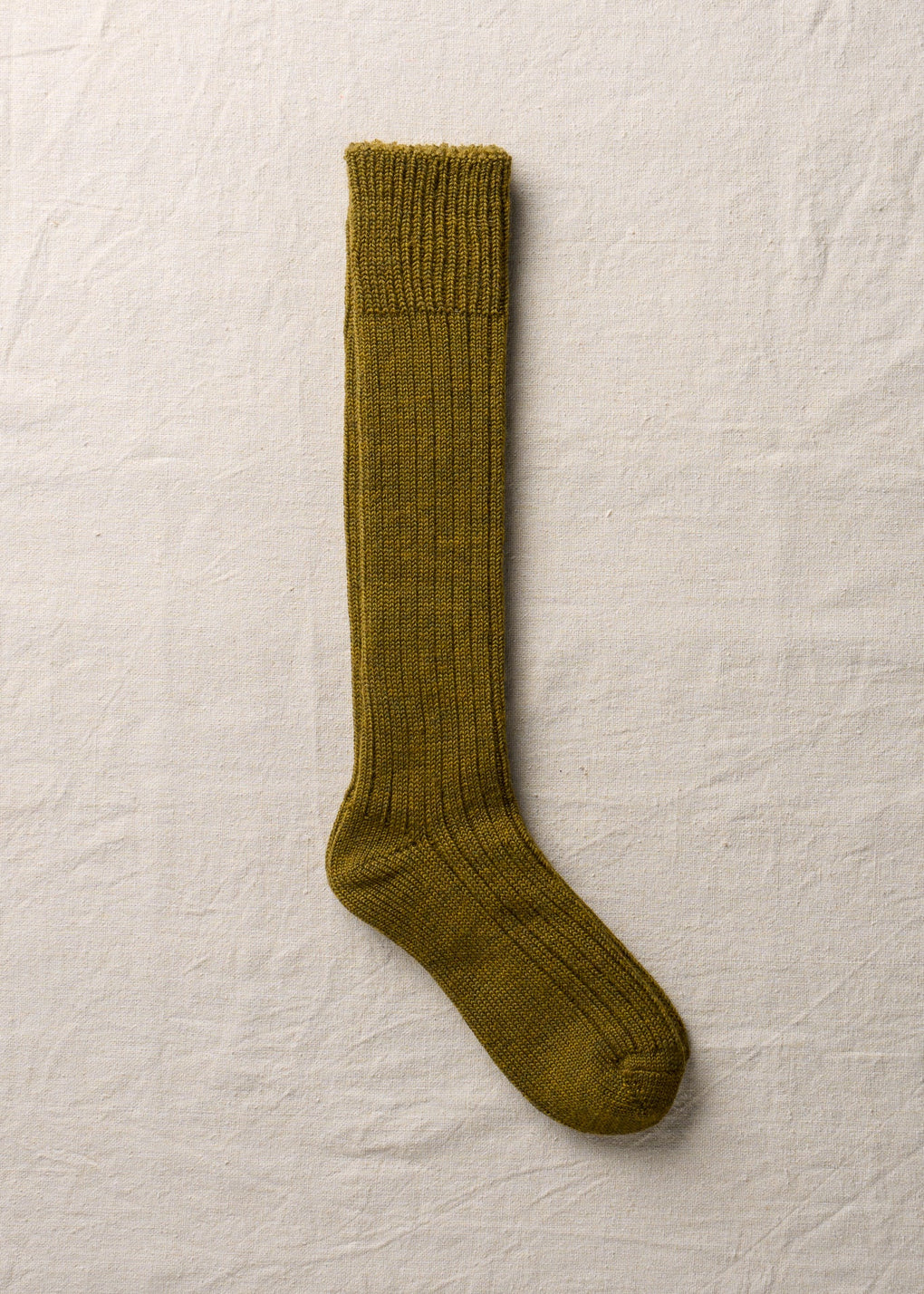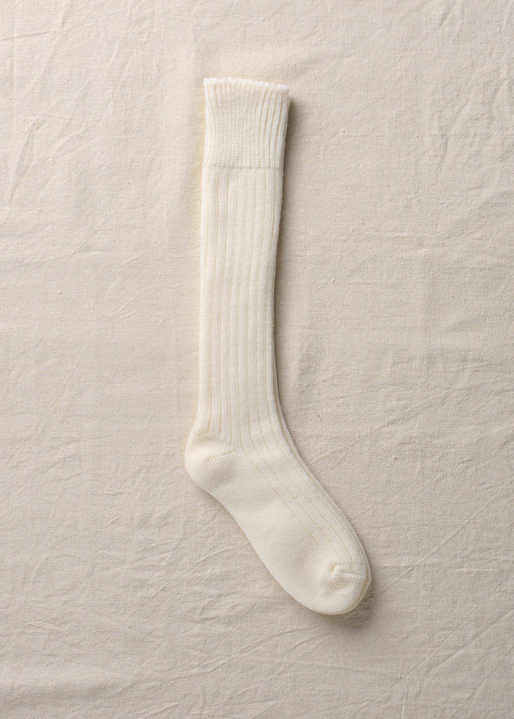 滑らかで肌触りの良い梳毛のウールで編み立てたローゲージハイソックス。旧式の編み機でゆっくりと丁寧に編み立てているので、しっかりと厚みがあります。丈は、ふくらはぎまでのハイソックス丈。ボリュームのある1足です。