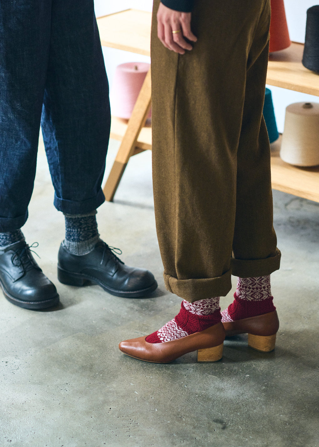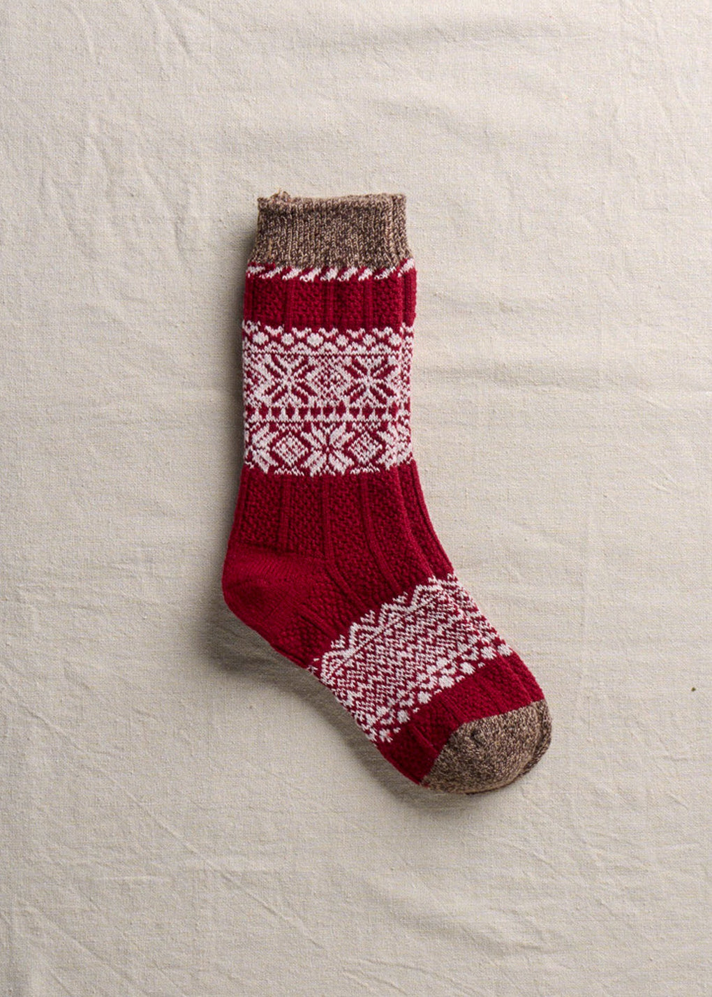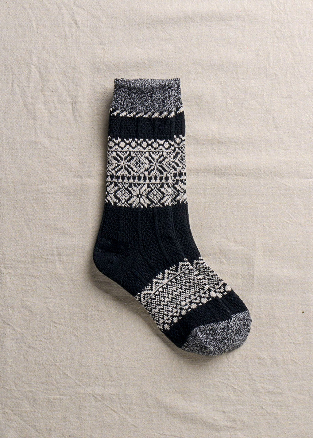 空気を多く含んだ膨らみのある紡毛のウールで編み立てたノルディック柄ソックス。北欧の自然を彷彿とさせる雪の結晶がデザインされています。どこか懐かしいレトロな雰囲気の一足です。柄にはオーガニックコットンを使用しています。