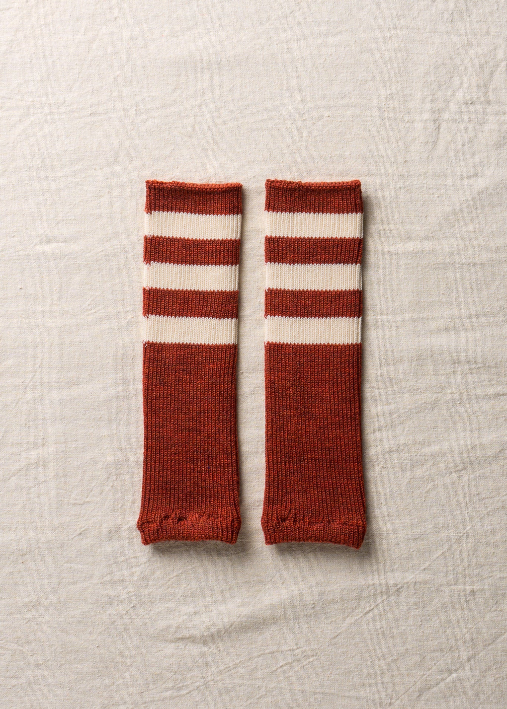 滑らかで肌触りの良い梳毛のウールで編み立てたアーム・レッグ兼用のウォーマー。ボーダーの配色にはオーガニックカラードコットンを使用しています。コットンの原色、そのままの色です。