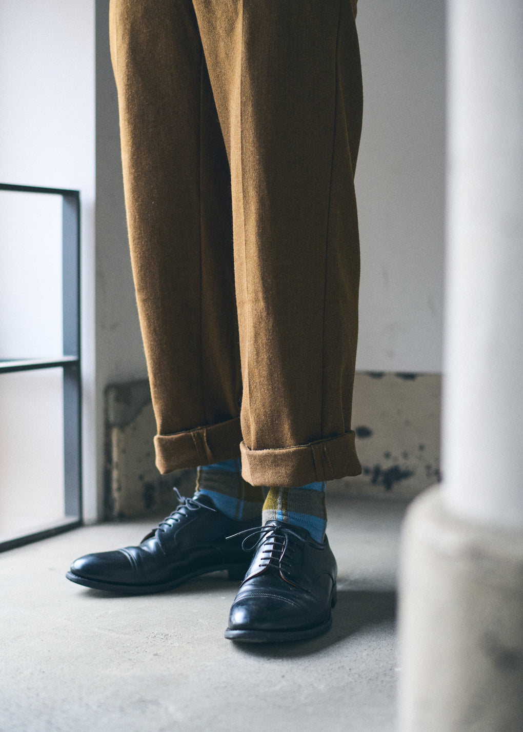 ヤクとオーガニックコットンをベースに、Xマシーンでブロック柄を編み立てたソックス。ヤクとカラードコットンがブレンドされた自然のままの色合いをベースに、柄には梳毛のウールを使用。爪先の縫い目はリンキング仕様です。保温性・吸放湿性に優れたヤクの毛は、温かさに加えて、蒸れない快適さがあります。秋冬シーズン以外でも一年を通して履いていただけます。
