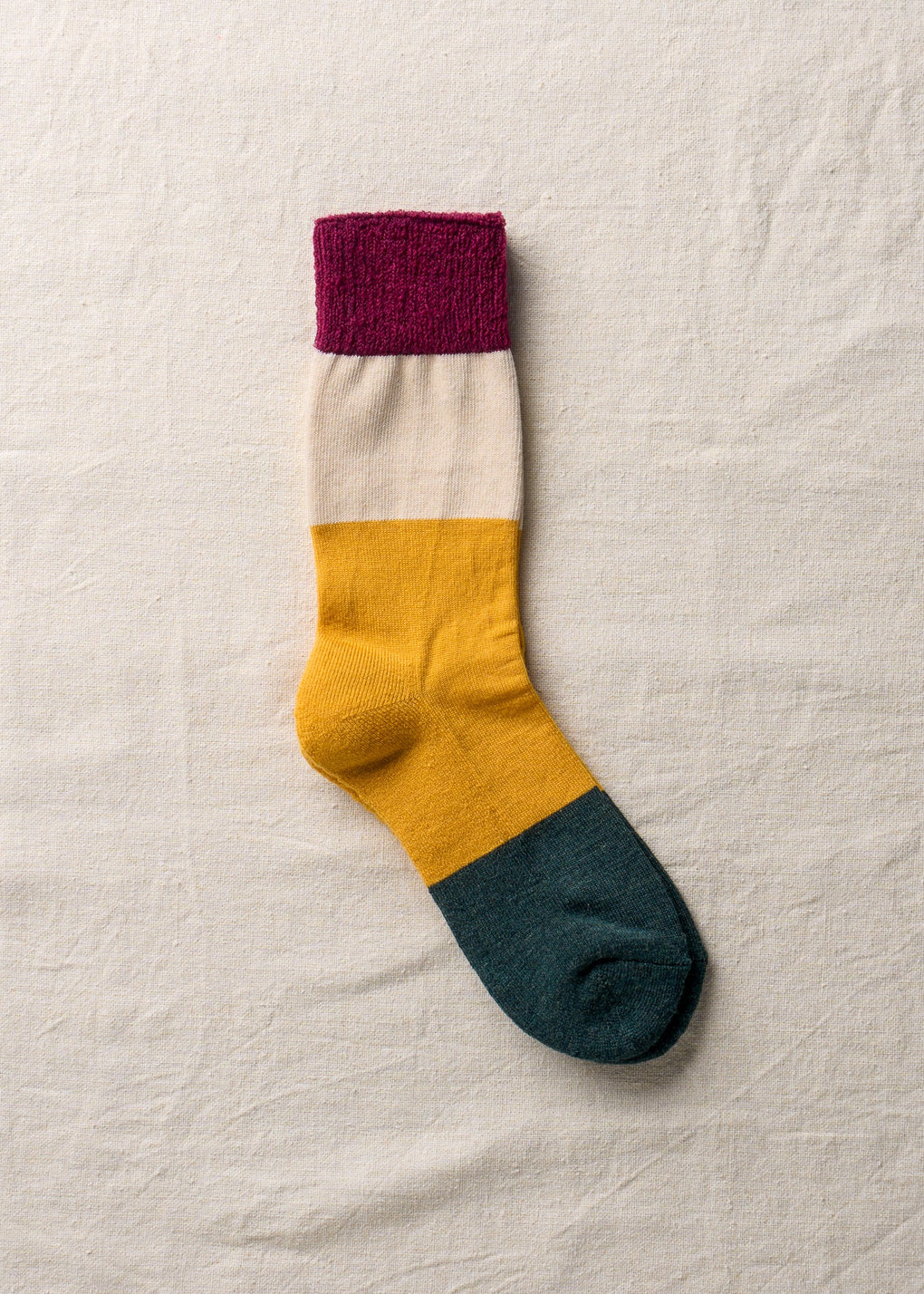 滑らかで肌触りの良い梳毛のウールで編み立てたパイルソックス。足底はパイル編みでクッション性を持たせ、甲側は靴の中で圧迫感が少ない平編みを用いました。履き口はあたたかみのある編み方で変化を付けています。配色の一部には、ヤクとカラードコットンがブレンドされた自然のままの色合いを使用しています。