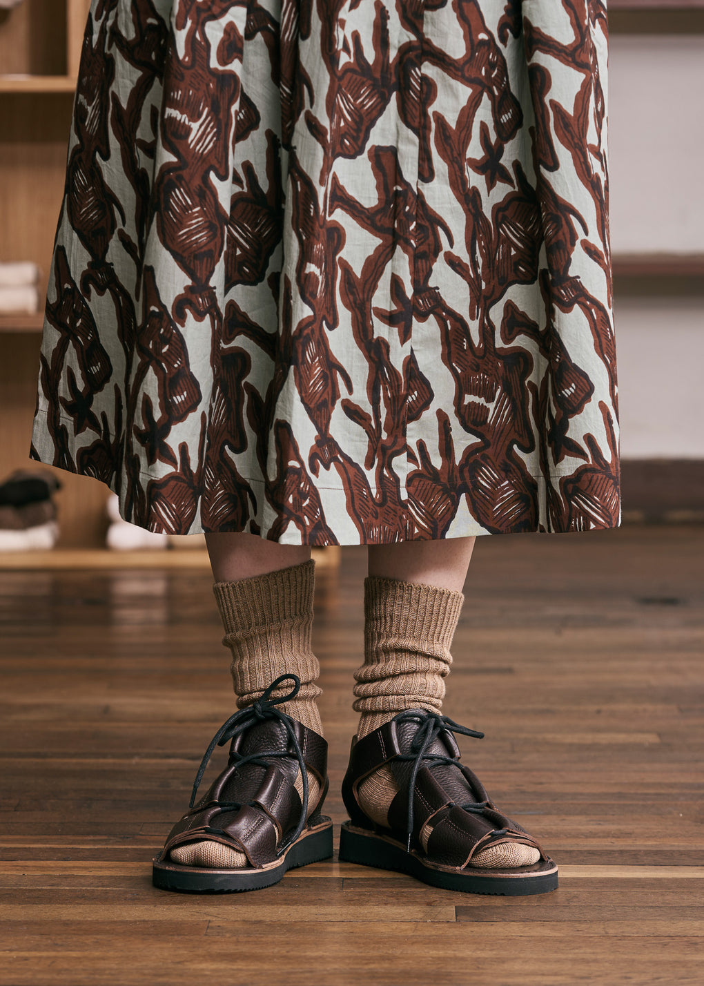 履き心地とデザイン、耐久性といった様々な観点からおすすめできる定番の一足。ビジネスシーンにも使える、やや長めの丈です。旧式のダブルシリンダーのローゲージ編機でゆっくりと編み上げた肉厚な仕上がりです。