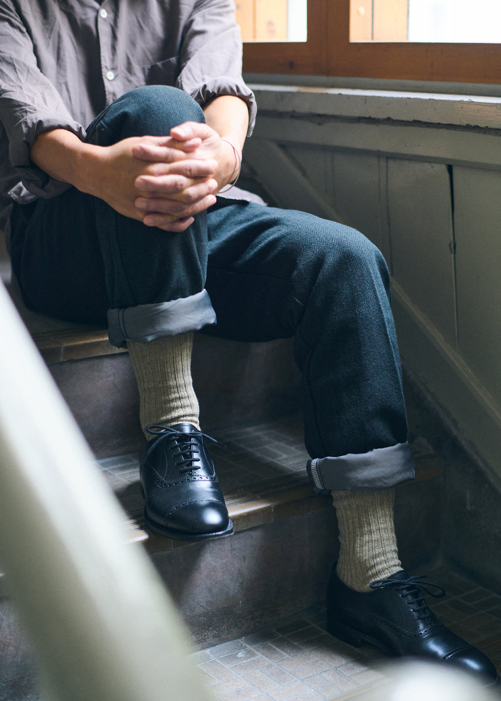履き心地とデザイン、耐久性といった様々な観点からおすすめできる定番の一足。ビジネスシーンにも使える、やや長めの丈です。旧式のダブルシリンダーのローゲージ編機でゆっくりと編み上げた肉厚な仕上がりです。